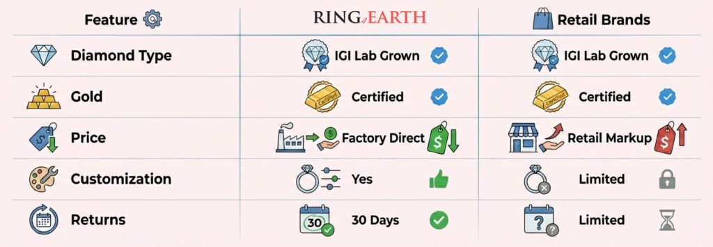 Ringsearth Jewels LLC has grown to become a globally trusted jeweler for handmade jewelry using lab grown diamonds over the 2yrs. Our expertise lies in our ability to produce a consistent supply of quality polished lab grown diamond in more than 31+ shapes, 5+ colors from melee to 10+ carat weight.