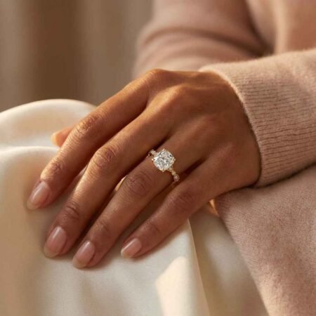 SKU: RE438Cushion Cut 1.96 Carat F VS1 IGI Certified CVD Diamond Wedding Ring in 14K Rose Gold – Hidden Halo & Side Round Diamonds
