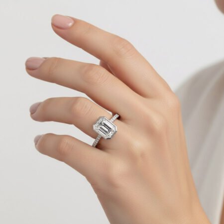 SKU: RE10822.5ct Emerald Cut E-F VS1 IGI Certified Lab Diamond Engagement Ring in 14K White Gold – Bezel Hidden Halo & Pave Accents