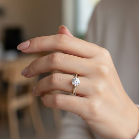 SKU: RE1095Round 1.5 Carat F Color VS1 IGI Certified Lab Diamond Engagement Ring in 14K Yellow Gold – Twisted Pave with Round Side StonesRated 4.67 out of 5