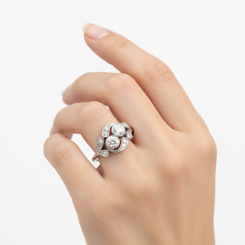Celebrate your unique connection with this exquisite 0.78ct Lab Grown Diamond Two Stone Ring. Often referred to as a “Toi et Moi” (You and Me) ring, this design features two brilliant round-cut diamonds nestled together in a romantic bypass swirl setting, symbolizing two souls becoming one.