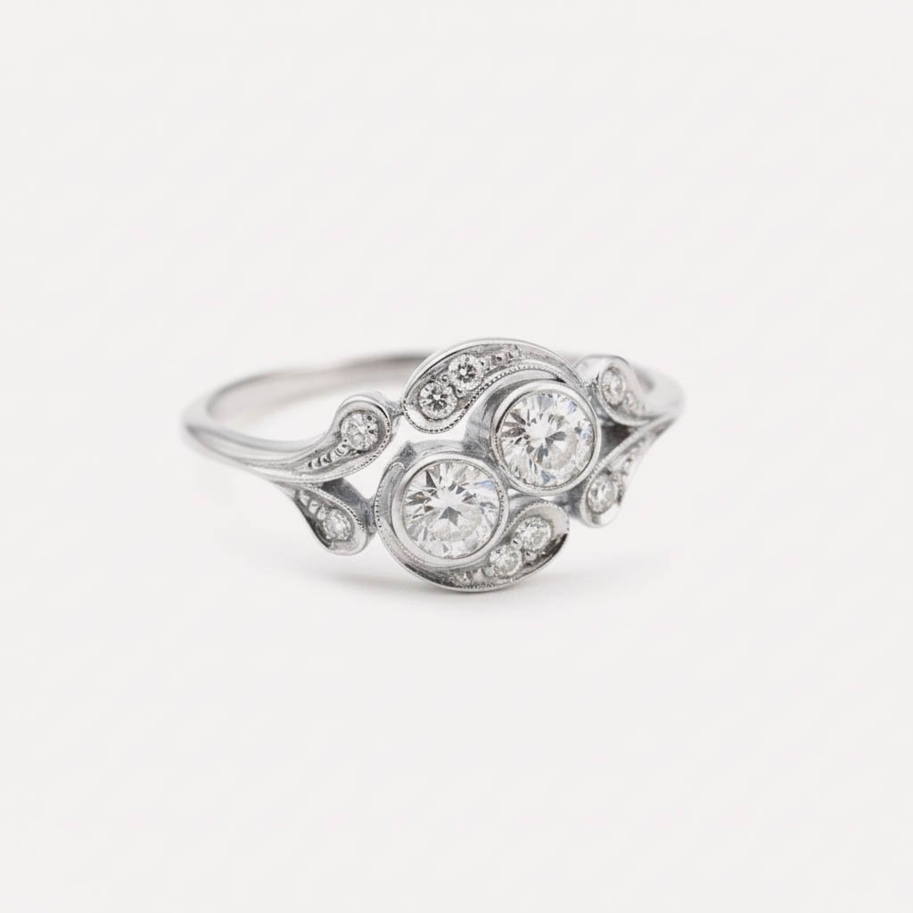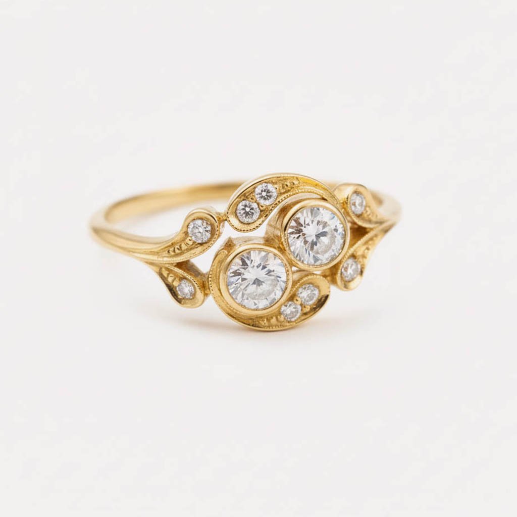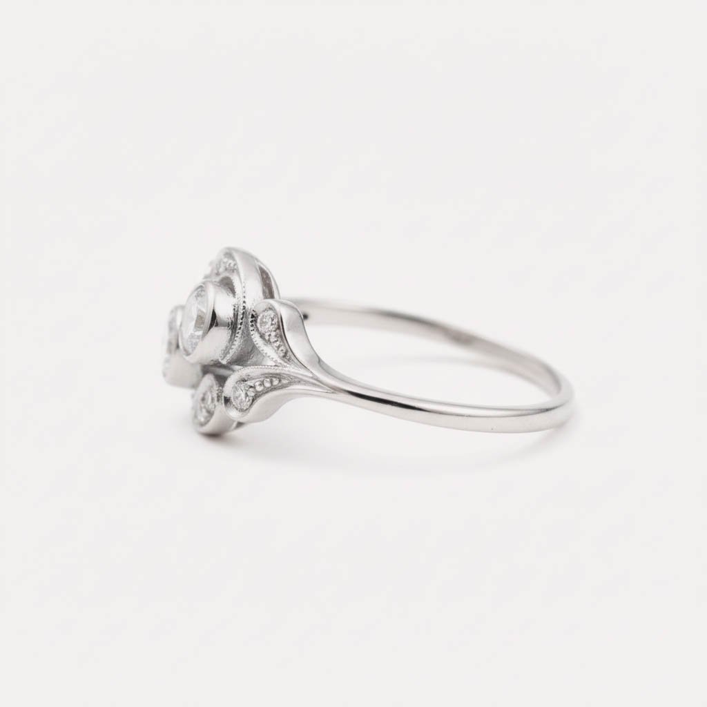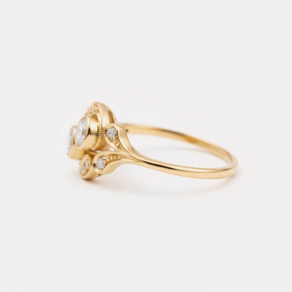 Expertly crafted in your choice of 14K White, Rose, or Yellow Gold, this ring draws inspiration from the Art Nouveau era with its fluid curves and delicate bezel settings. The vintage aesthetic is elevated by intricate millgrain detailing and shimmering accent diamonds that trace the elegant curves of the band.