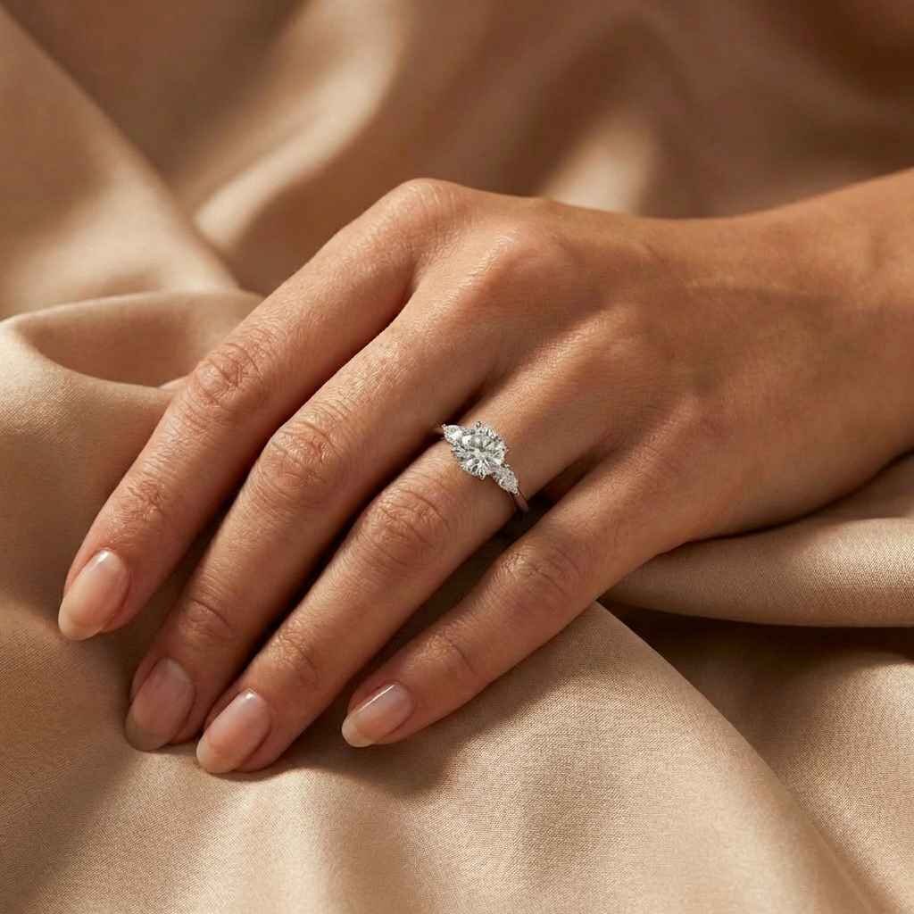 This IGI-certified 1.00 carat round lab-grown diamond ring features 0.55ctw pear-shaped side stones, crafted in 14K solid gold. A modern three-stone engagement ring with a straight shank and minimalist style, perfect for women who love timeless elegance. Also available in 10K and 18K gold options.