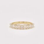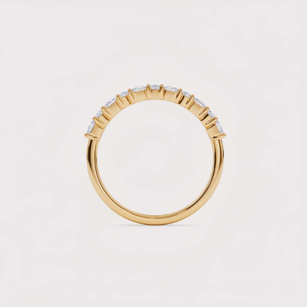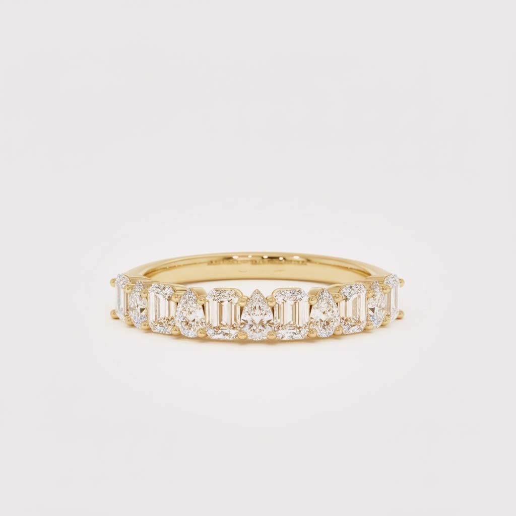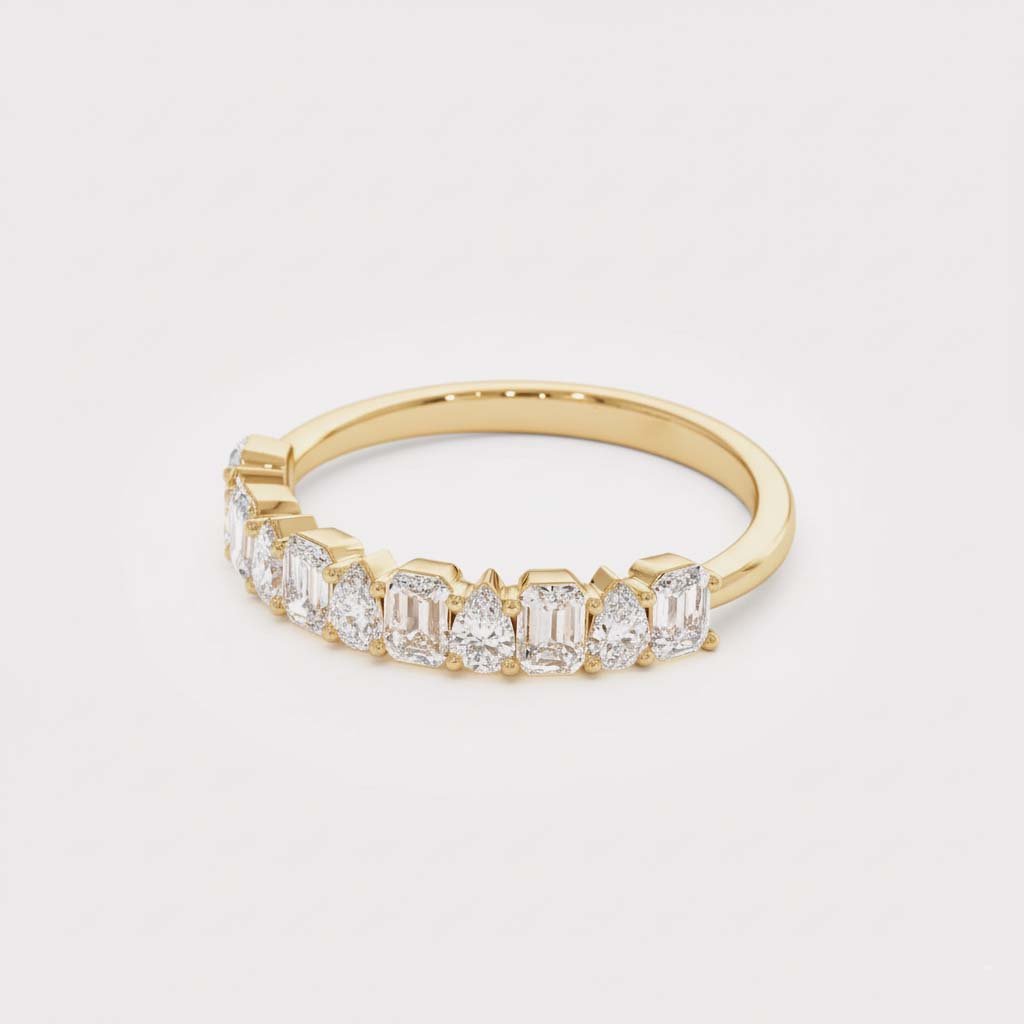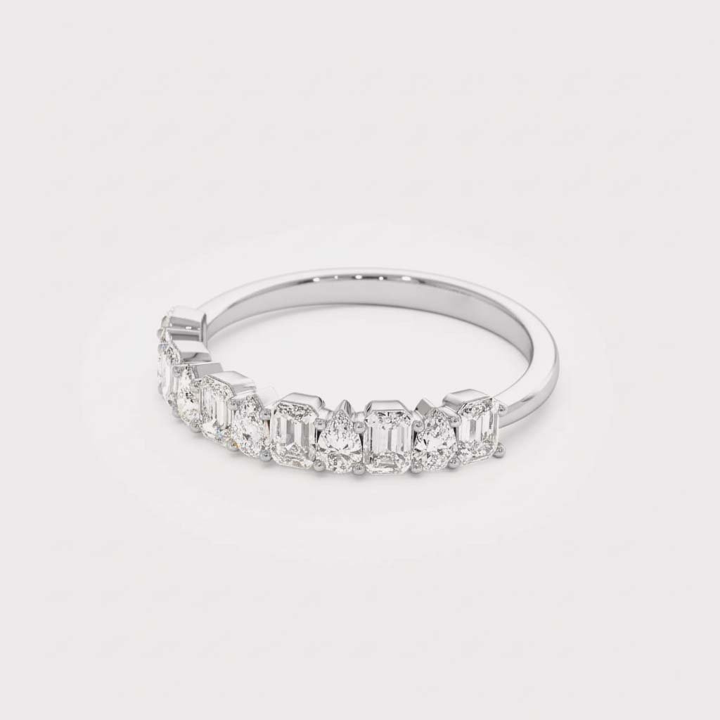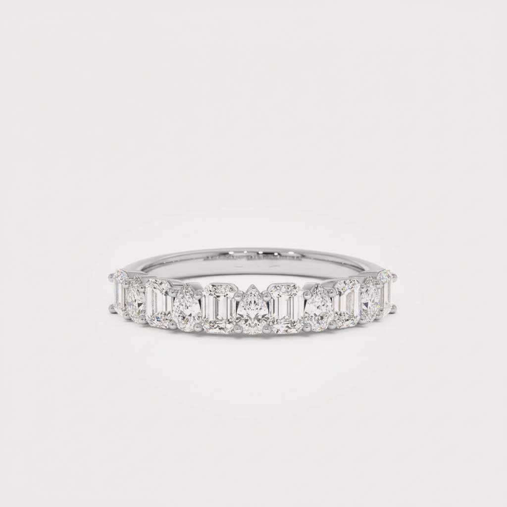 Create a stunning, one-of-a-kind stack with our 1.01 ctw (approx.) Mixed Cut Lab Diamond Wedding Band. This unique half-eternity ring features a captivating “mosaic” pattern of alternating diamonds: sophisticated Emerald Cuts and brilliant Pear Cuts.