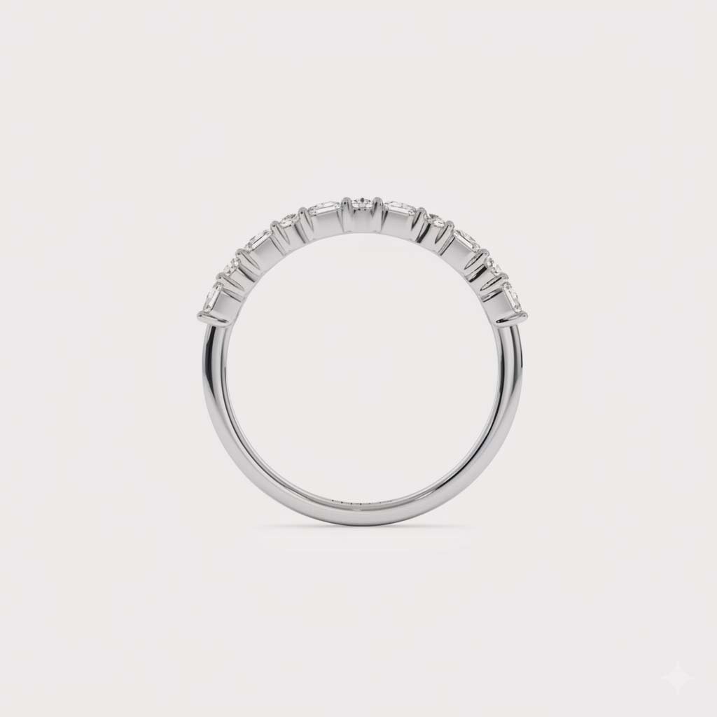 The diamonds are set in a shared-prong style, which minimizes metal and allows for a continuous, dazzling line of sparkle. Each high-quality CVD diamond is an exceptional EF Color and VS1 Clarity, delivering a bright, eye-clean display of fire and geometry.