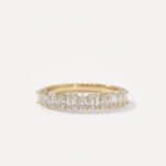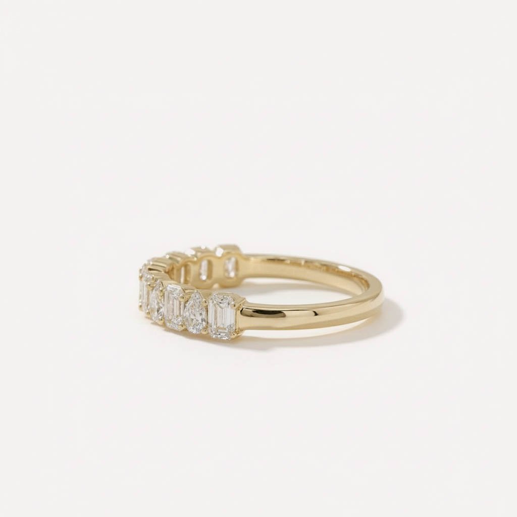 Create a stunning, one-of-a-kind stack with our 1.01 ctw (approx.) Mixed Cut Lab Diamond Wedding Band. This unique half-eternity ring features a captivating “mosaic” pattern of alternating diamonds: sophisticated Emerald Cuts and brilliant Pear Cuts.