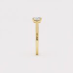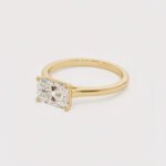 The diamond is set horizontally in a trendy “east-west” orientation, creating a unique, elongated look on the finger. A secure 4-prong setting holds the stone, which is set on a delicate, polished solid gold band.