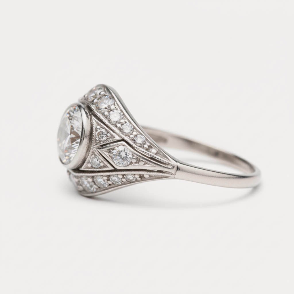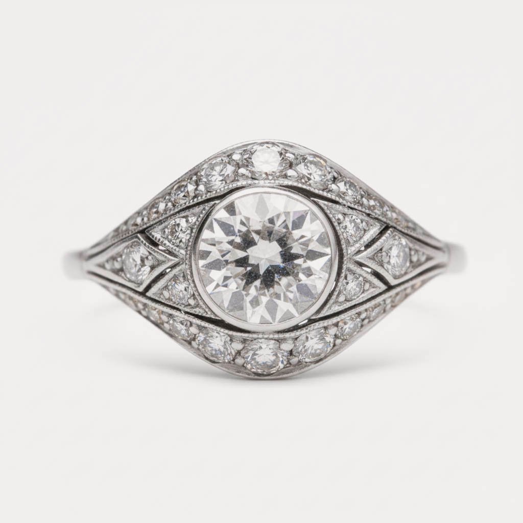 The ring features a brilliant Round Cut Lab Grown Diamond (approx. 1.08 ctw), boasting superior EF Color (colorless) and VS1 Clarity. The center stone is securely bezel-set, surrounded by a complex geometric pattern that includes 0.13 ctw of round accent diamonds. The intricate milgrain detailing and marquise-like design elements on the shoulder enhance the antique, heirloom quality of the piece.