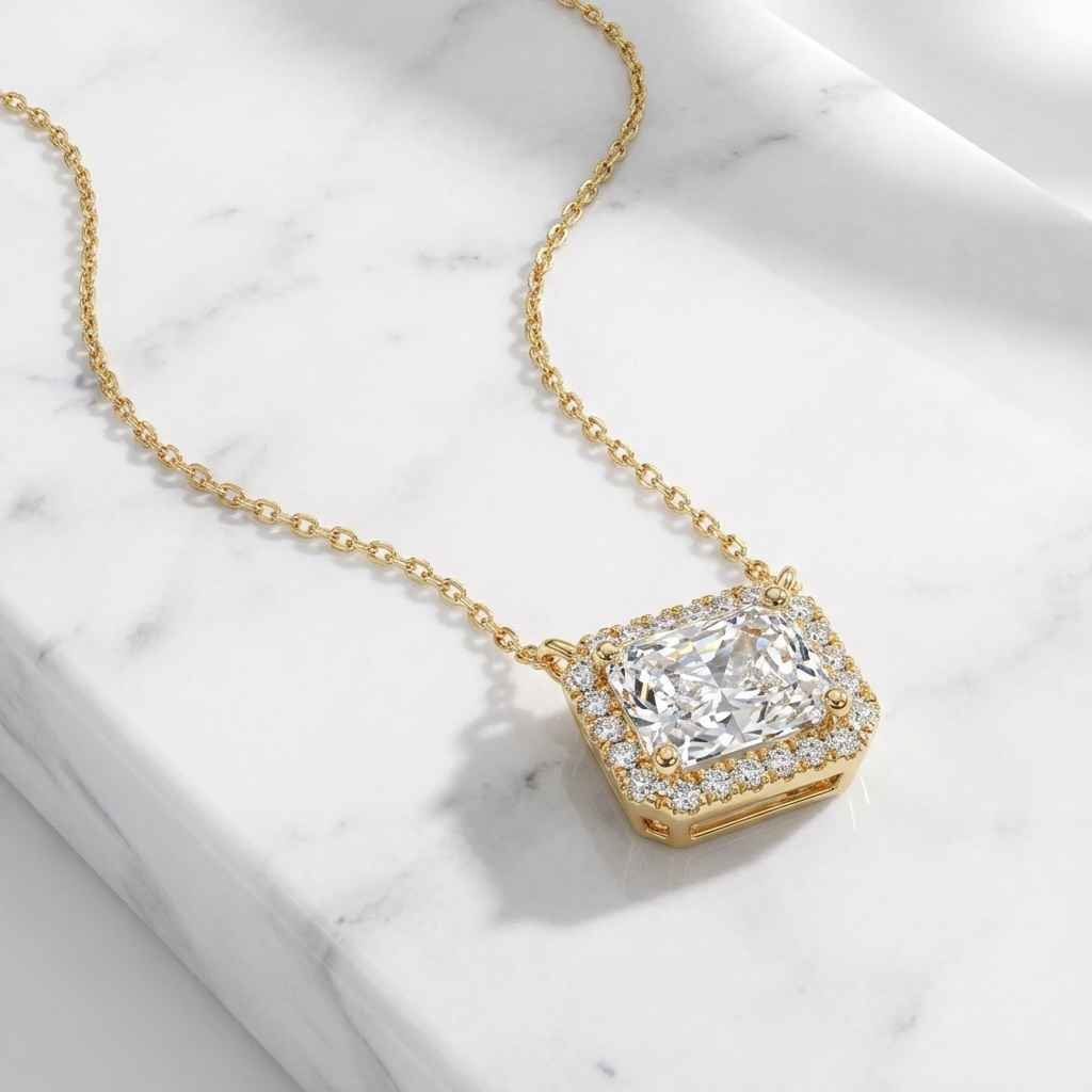 1.12 TCW 14K Yellow Gold Radiant cut Solitaire with Halo Lab Diamond Cluster Necklace RE851