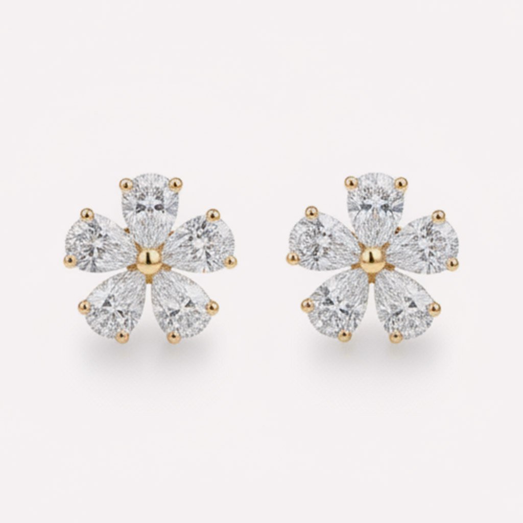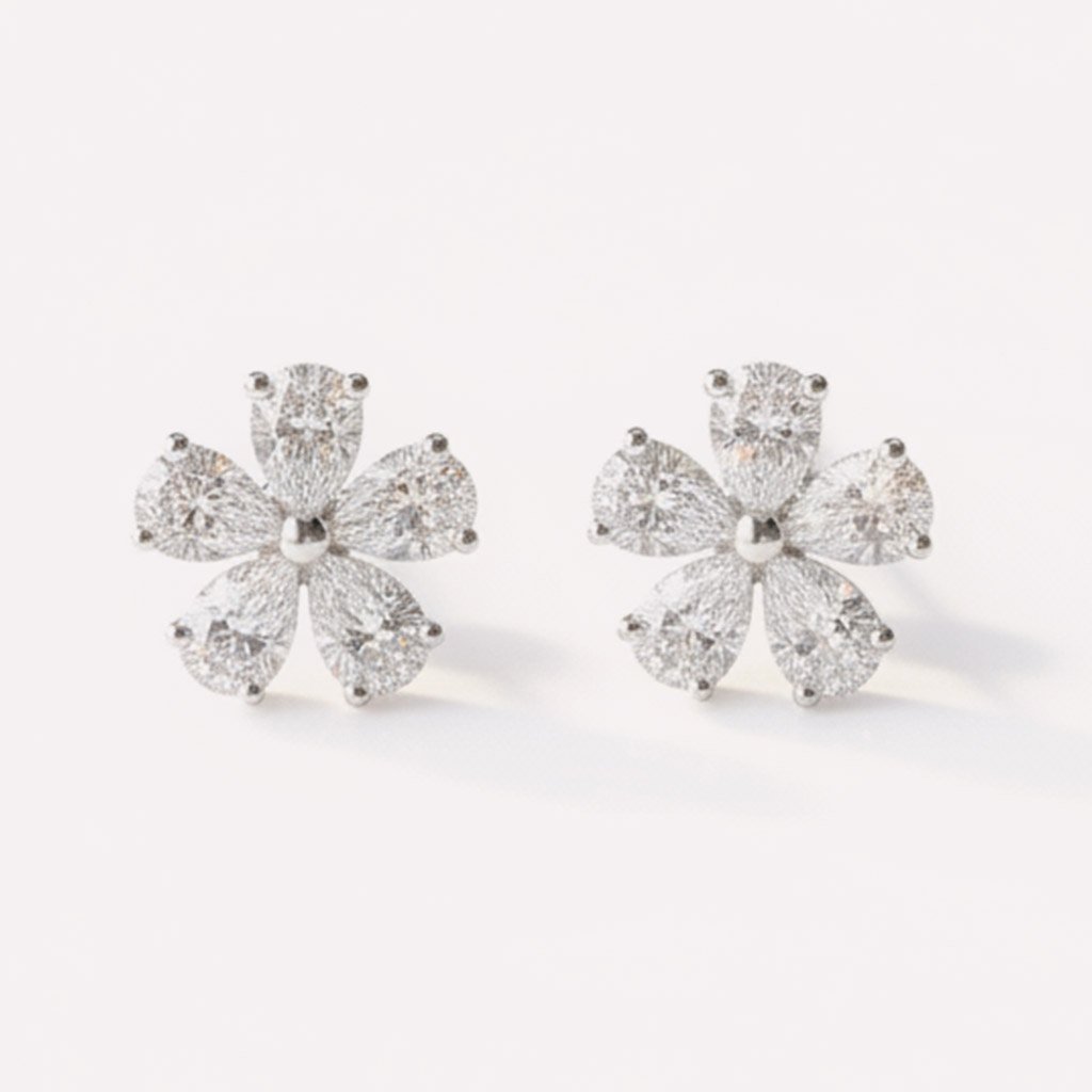 Crafted with elegance and femininity, these floral-inspired lab diamond earrings feature 1.20 carat total weight of IGI-certified CVD diamonds. Each earring is set with four 0.15ct pear-cut diamonds arranged in a blooming four-petal pattern, secured in polished 18K gold. Perfect for weddings, gifting, or daily sparkle with a nature-inspired twist.