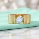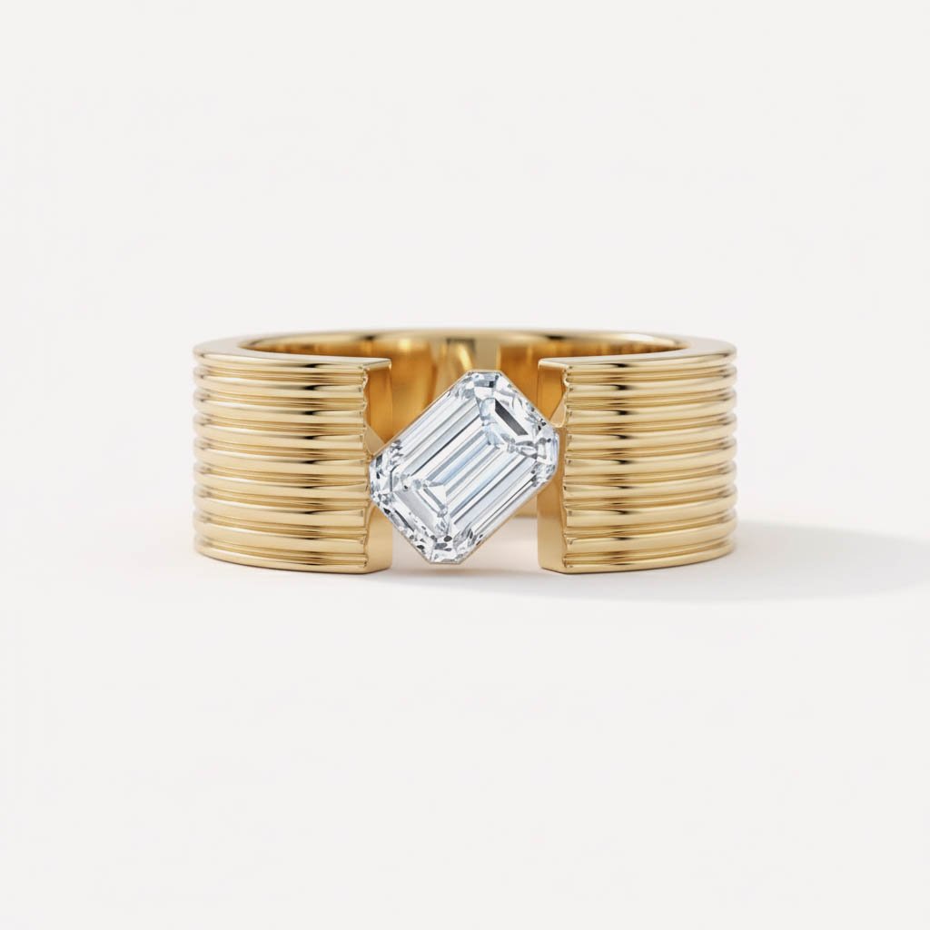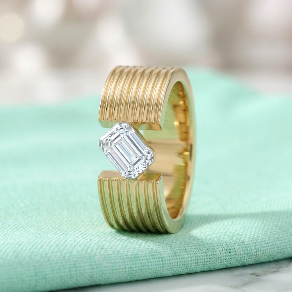 Make a powerful style statement with this 1.22 Ct Emerald Cut Lab Grown Diamond Engagement Ring, designed in a striking open-band ribbed setting that blends architectural design with refined elegance.