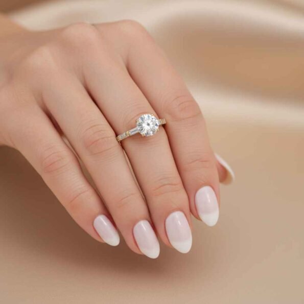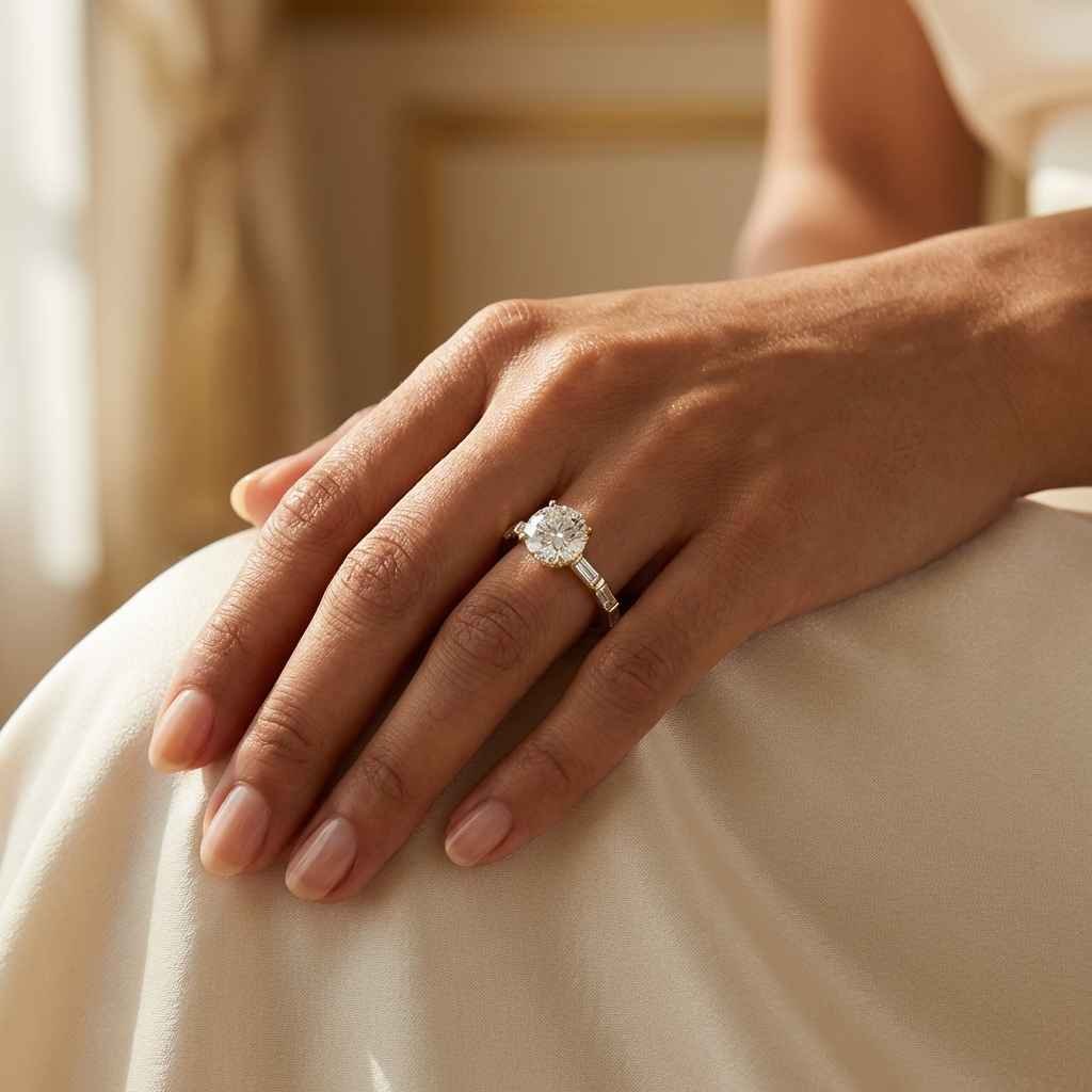 Handcrafted with SGL-certified lab diamonds and 14K gold, this ring is an ethical, sustainable, and conflict-free alternative to mined diamonds. The hidden halo and baguette side stones enhance the round diamond’s brilliance, offering a modern yet classic aesthetic.