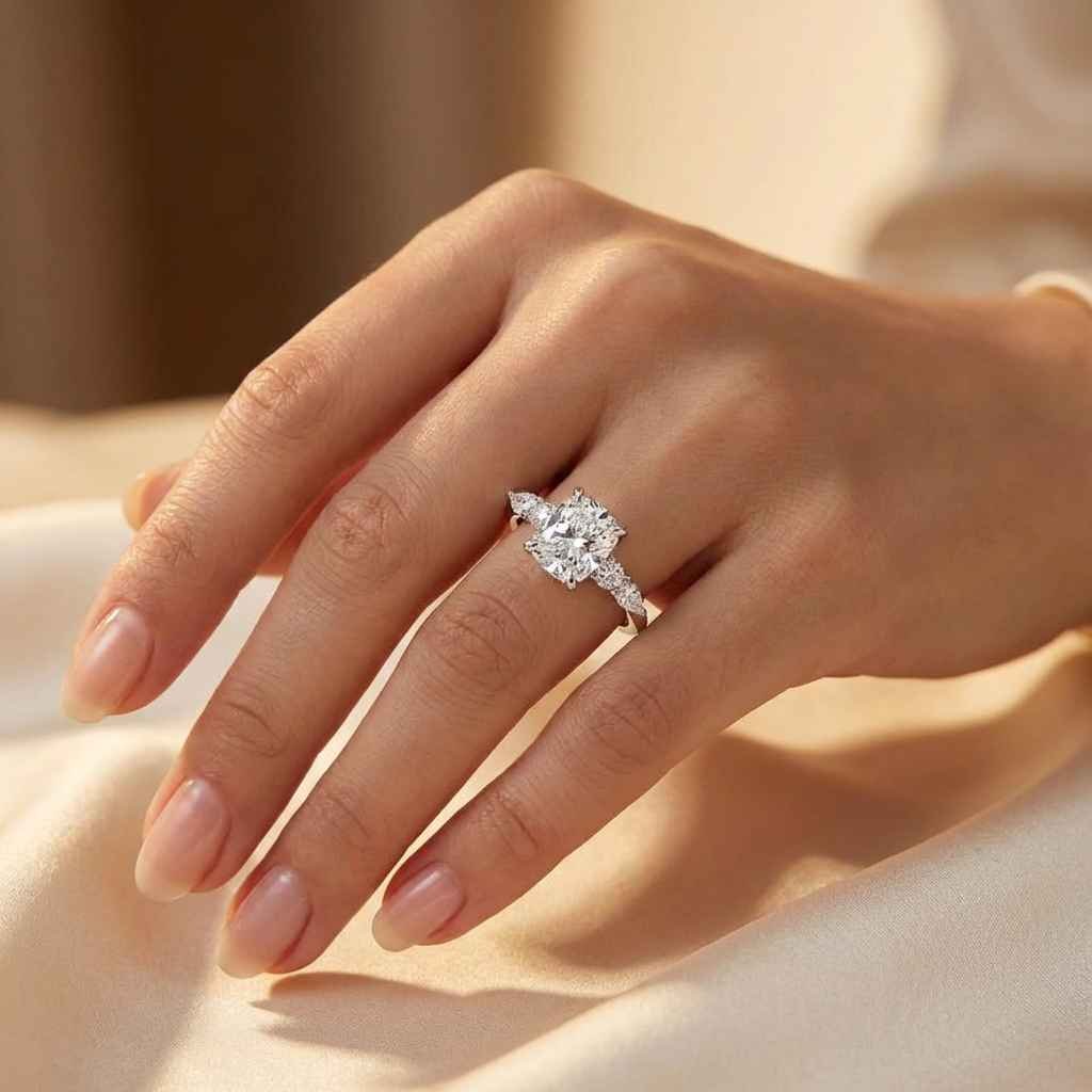 Make a statement of love with this 1.50ct Cushion Cut Diamond Engagement Ring in 14K White Gold. Featuring a stunning elongated cushion cut lab diamond, this ring embodies elegance and sophistication. The 0.35ct round and pear cluster side diamonds add extra brilliance, making it a timeless choice for those seeking a cushion cut engagement ring.