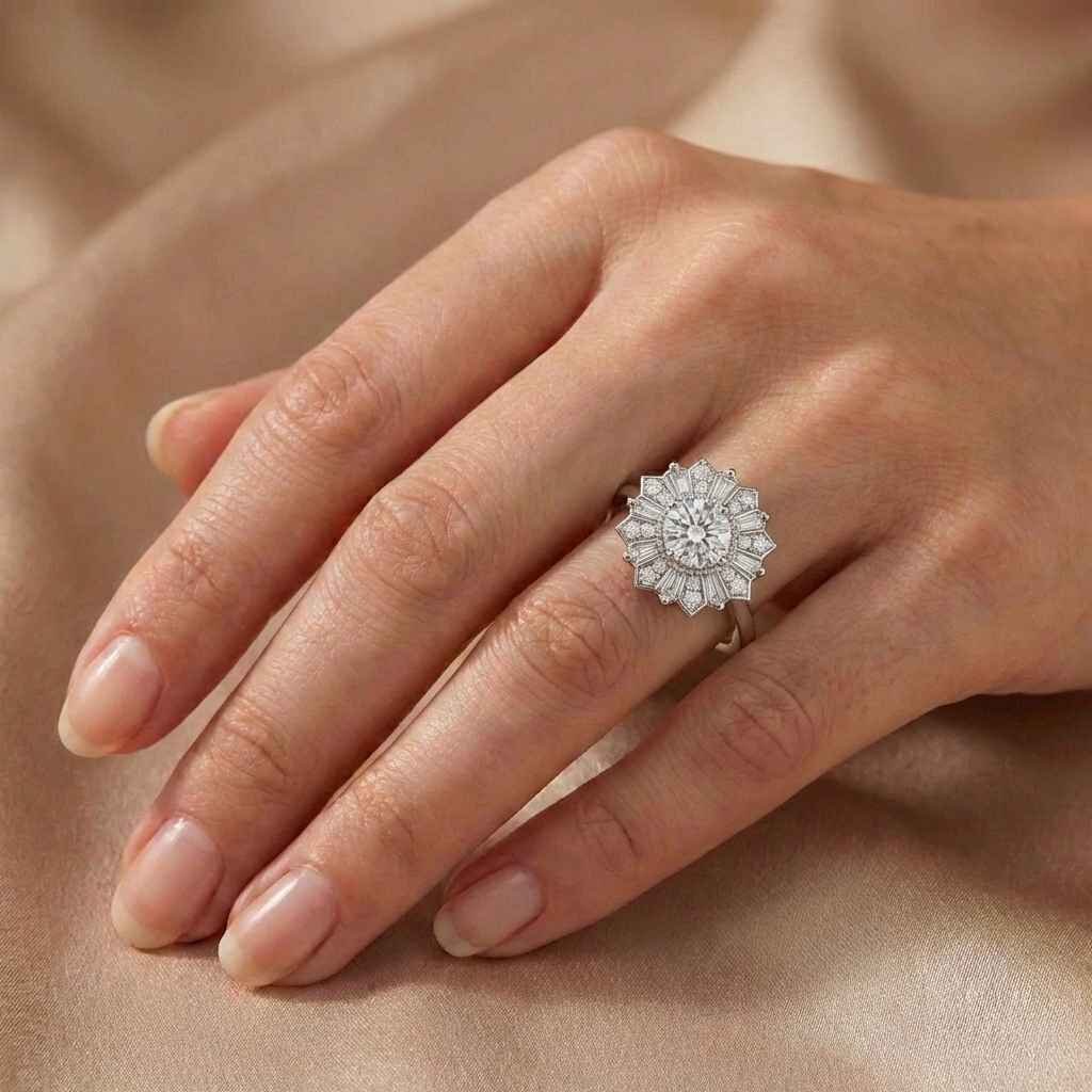 This vintage-inspired floral halo ring features a 1.50 carat IGI-certified round cut lab-grown diamond set in radiant 18K rose gold. Surrounded by alternating round and tapered baguette lab diamonds in a dazzling sunburst cluster, this statement ring blends Art Deco elegance with modern sophistication. Ideal for engagements, anniversaries, or luxury gifting.