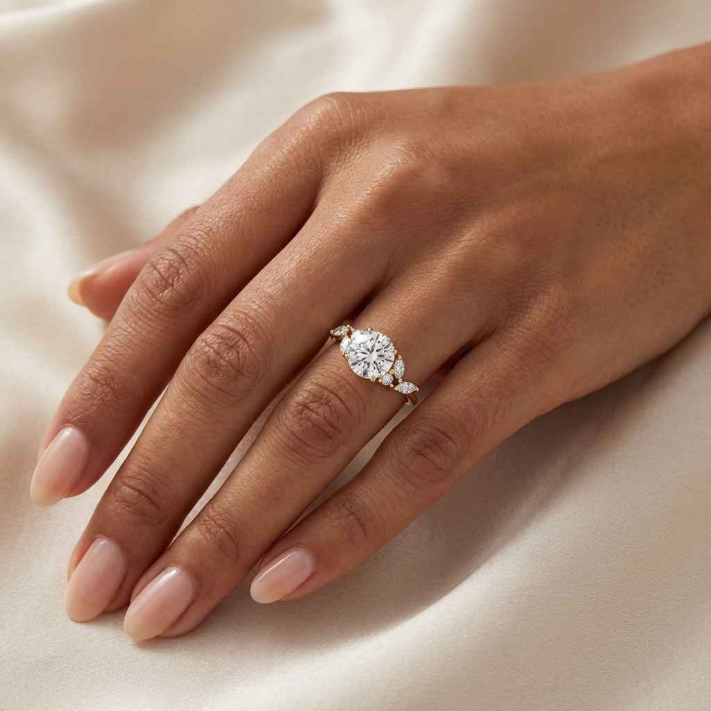 Expertly crafted in 14K gold, this round diamond engagement ring is designed to last a lifetime. Each lab-grown diamond is SGL-certified, ensuring ethical sourcing, premium quality, and exceptional sparkle. The halo of marquise-cut diamonds enhances the center stone’s brilliance, making this an ideal choice for those who love vintage-inspired yet modern engagement rings.