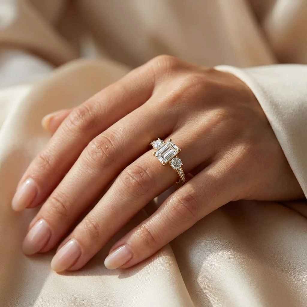 At the center rests a magnificent 1.52 carat Emerald Cut Lab Grown Diamond, IGI Certified for its exceptional quality. The emerald cut is loved for its “hall of mirrors” effect, offering deep clarity and understated elegance.
