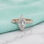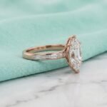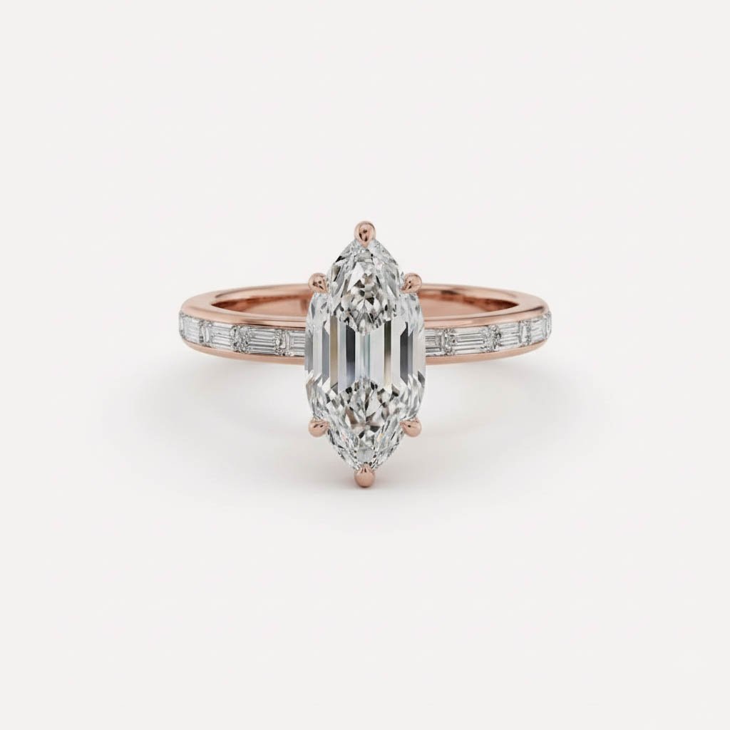 This sophisticated Marquise Step Cut Lab Grown Diamond Engagement Ring features a striking 1.53 Ct center diamond, beautifully complemented by baguette-cut side stones for a clean, architectural look.