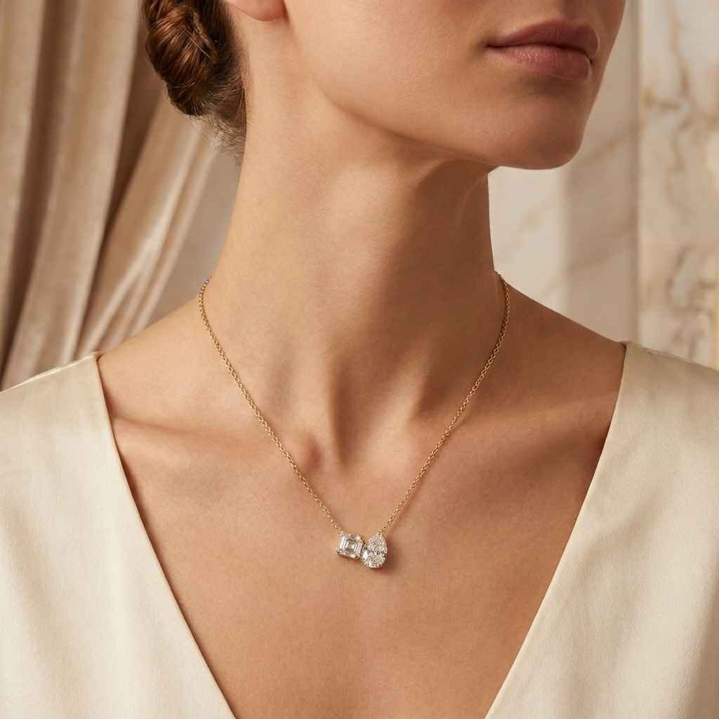 Celebrate elegance and modern luxury with our 1.58CTW Toi Et Moi Lab Diamond Necklace. This stunning gold necklace for women features two exquisite lab-grown diamonds in an Asscher and Pear cut, set in a sophisticated half bezel setting. Designed for daily wear, this pendant is the perfect anniversary gift, birthday present, or a timeless jewelry piece for any occasion.
