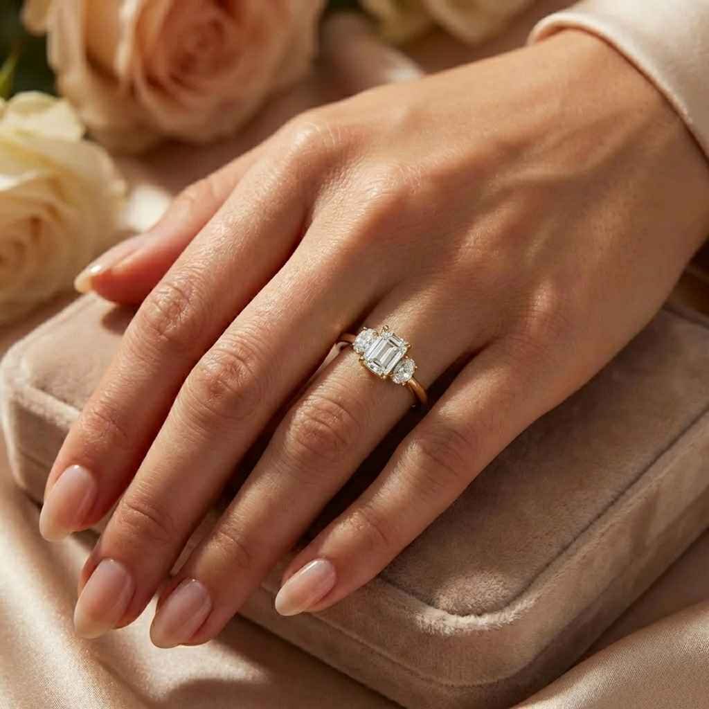 Experience the perfect harmony of geometric lines and soft curves with this IGI Certified Three-Stone Engagement Ring. The centerpiece is a spectacular 1.53 ct (approx.) emerald-cut lab-grown diamond, celebrated for its sophisticated step-cut facets.