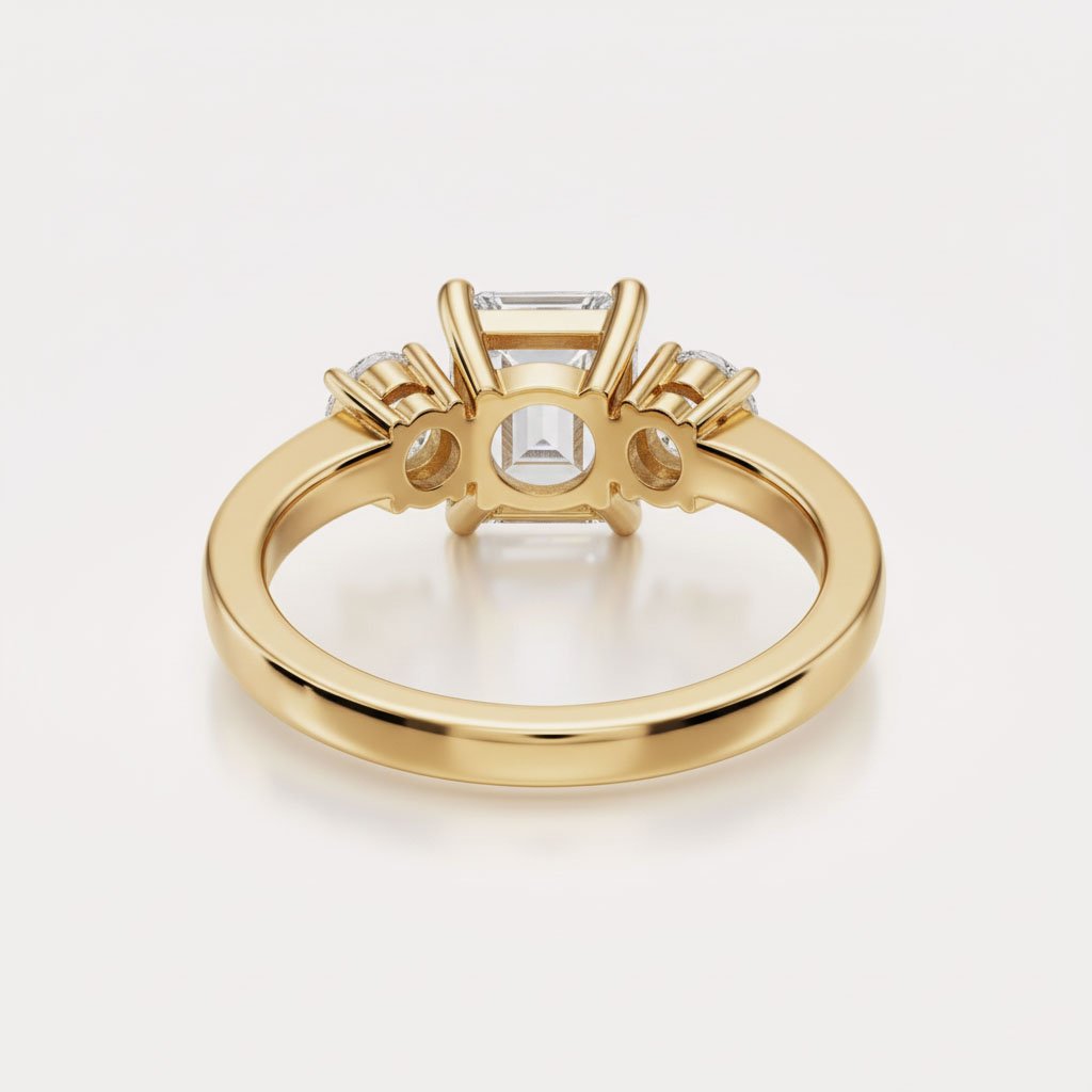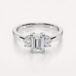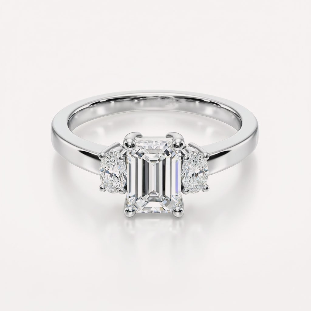 Experience the perfect harmony of geometric lines and soft curves with this IGI Certified Three-Stone Engagement Ring. The centerpiece is a spectacular 1.53 ct (approx.) emerald-cut lab-grown diamond, celebrated for its sophisticated step-cut facets.