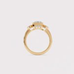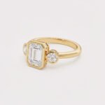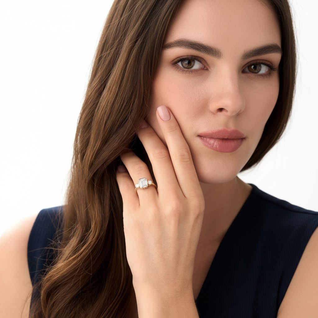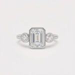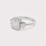 A stunning, modern take on the classic three-stone ring, this piece is a masterpiece of Art Deco-inspired design. It features a magnificent 1.55 ct (approx.) emerald-cut lab-grown diamond, celebrated for its elegant, step-cut facets.