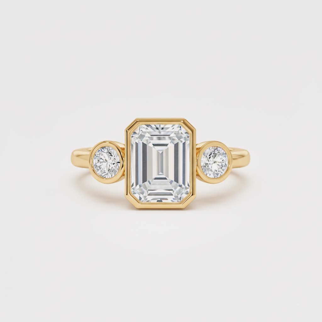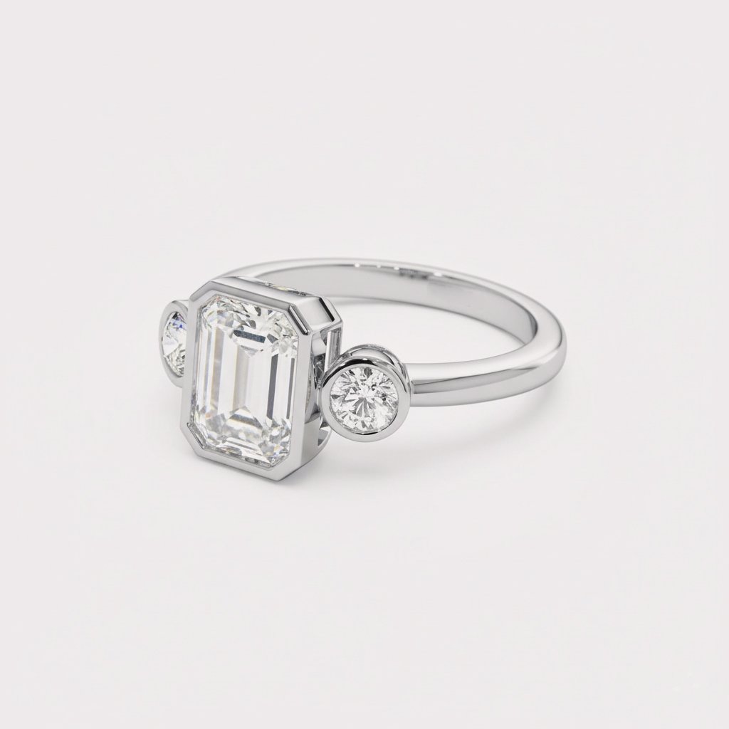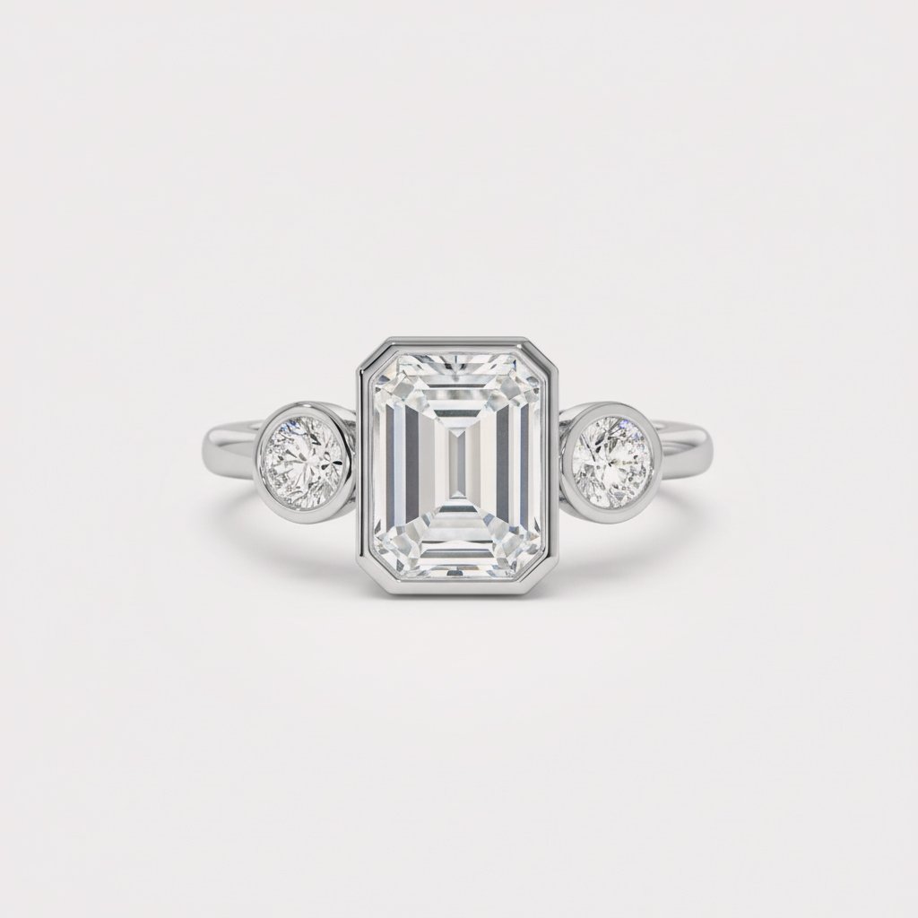 1.89 ctw Three Stone Lab Diamond Ring | 1.55 ct Emerald Cut Center | Bezel Set | Solid Gold