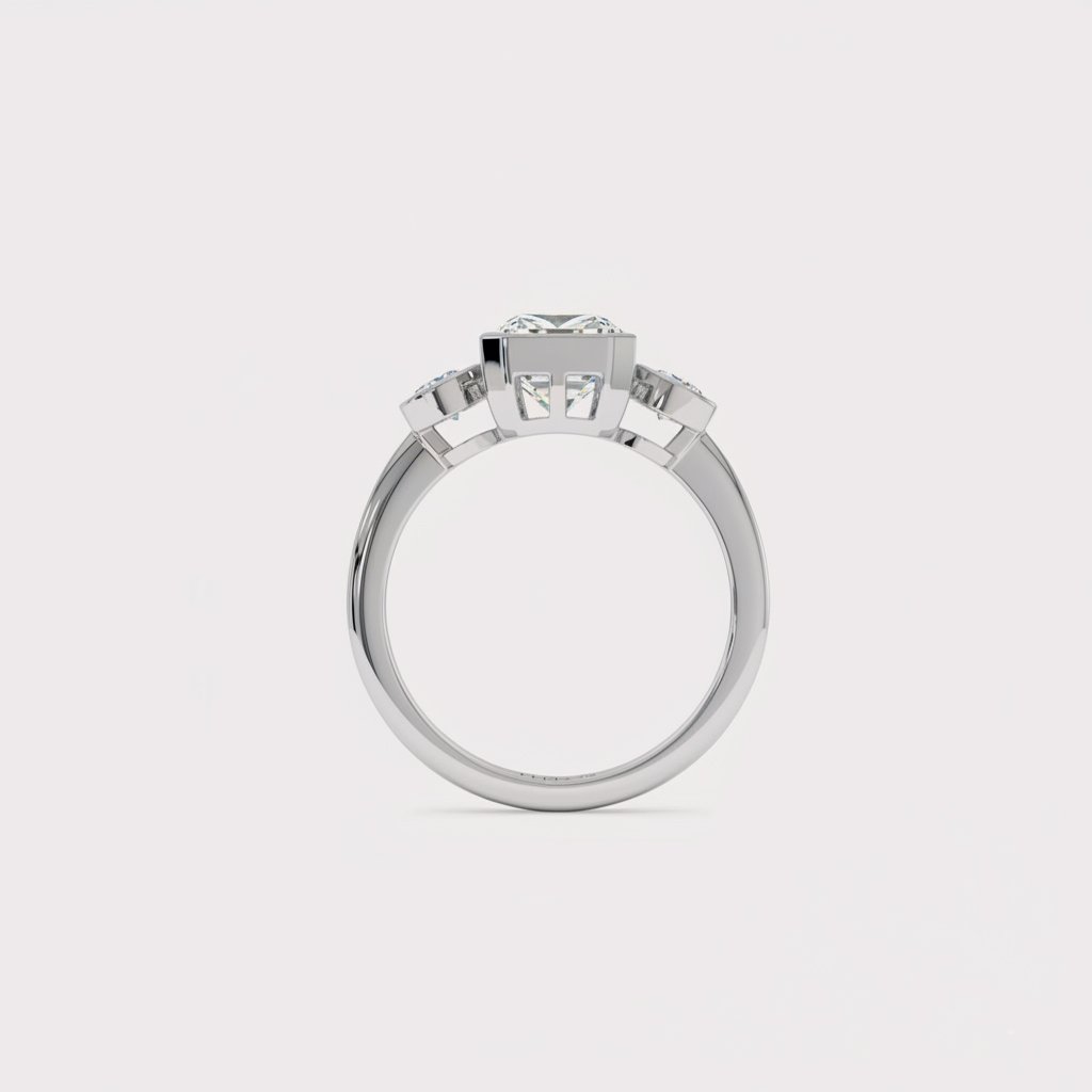The center stone is flanked by two brilliant, round-cut lab diamonds (0.34 ctw). All three stones are secured in sleek, protective bezel settings that highlight their shapes. The total carat weight is an impressive 1.89 ctw.