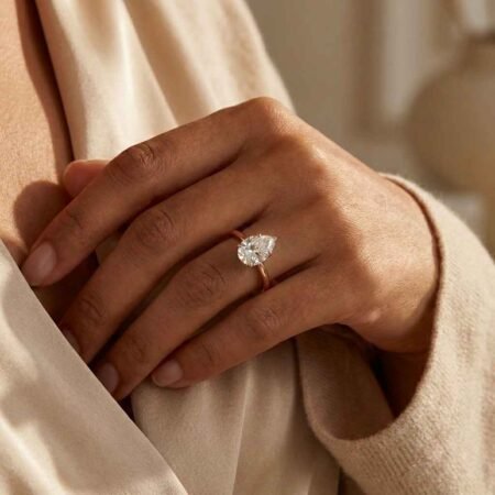 Elegant 1.96 CT IGI Certified Pear Cut CVD Diamond ring crafted in exquisite 14K Rose Gold. This stunning piece features a radiant Pear Cut Diamond, certified by IGI, enhanced with a hidden halo design, perfect for engagements and special occasions.