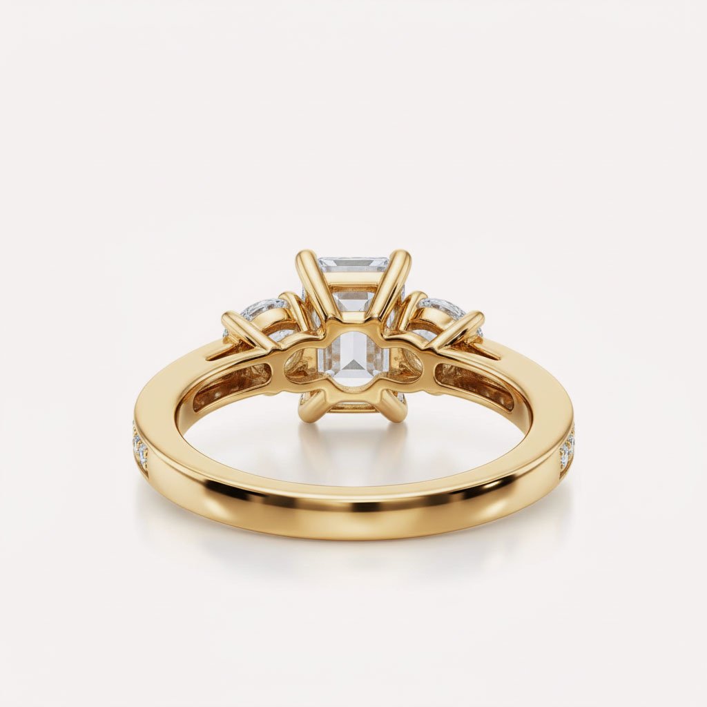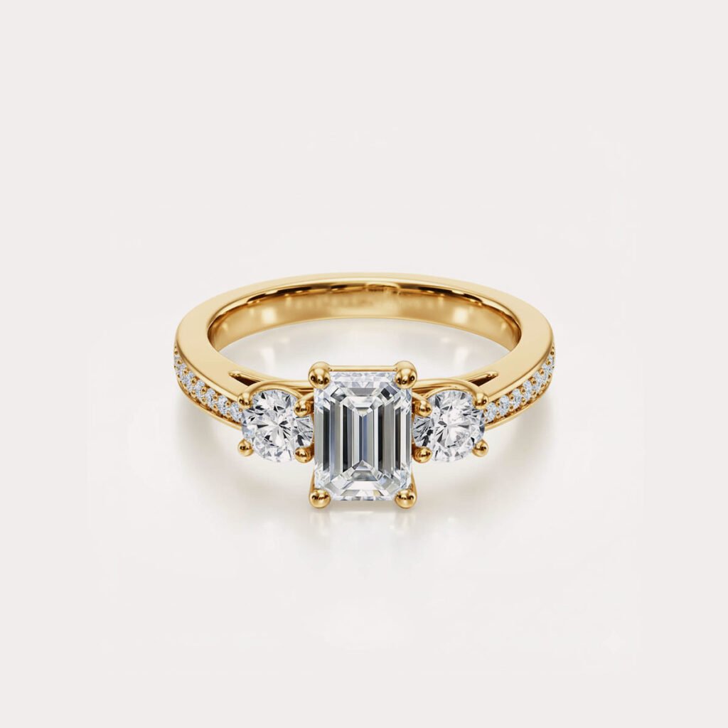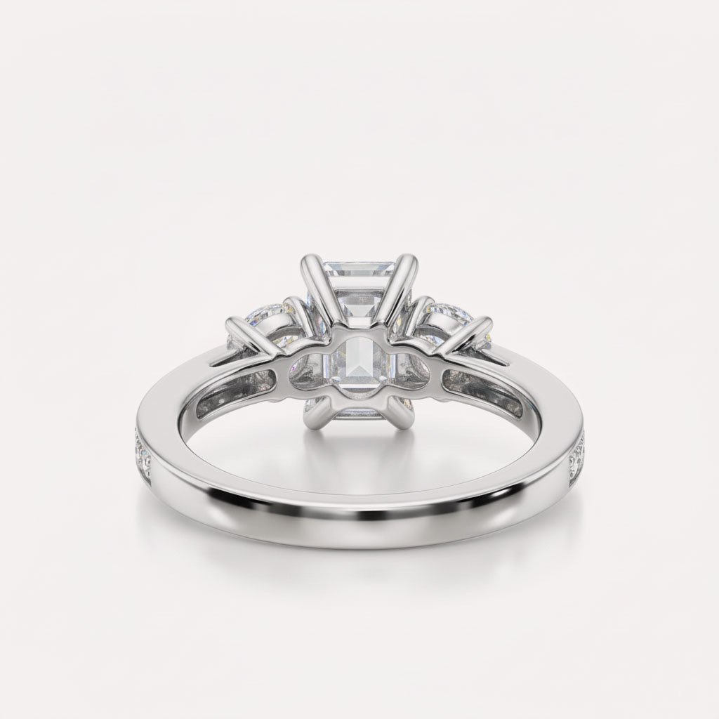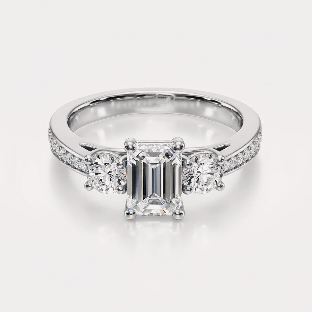 Celebrate your past, present, and future with this exquisite IGI Certified Three-Stone Engagement Ring. The centerpiece is a magnificent 1.52 ct (approx.) emerald-cut lab-grown diamond, renowned for its sophisticated step-cut facets and hall-of-mirrors effect.