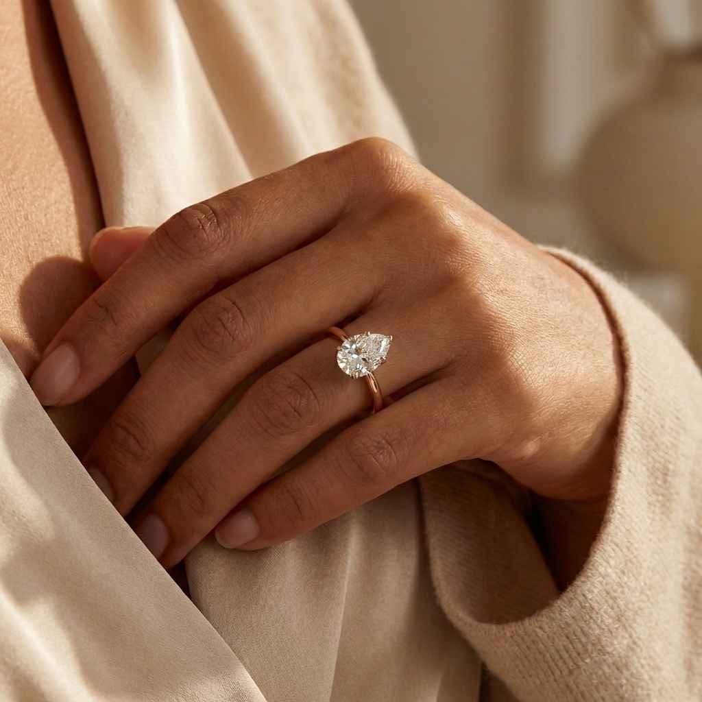 Crafted to symbolize grace and romance, this 2.00 Carat Pear Cut CVD Lab Grown Diamond Ring in 14K Rose Gold radiates elegance. The ethically sourced, IGI-certified EF/VS1 diamond is set in a refined hidden halo that enhances brilliance while keeping the design sleek and modern.