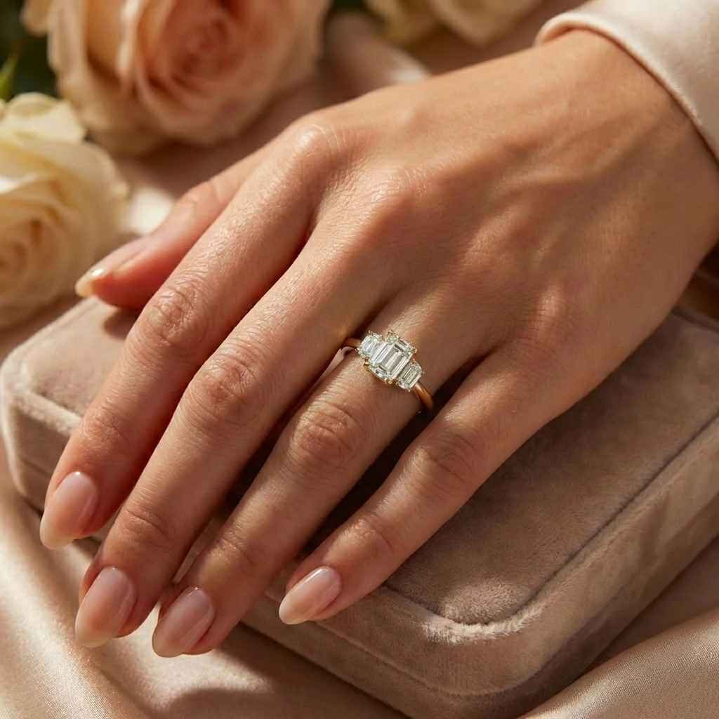 Exude timeless sophistication with this IGI Certified Three-Stone Engagement Ring. This design is a masterclass in “step-cut” beauty, creating a hall-of-mirrors effect that captivates the eye.