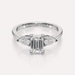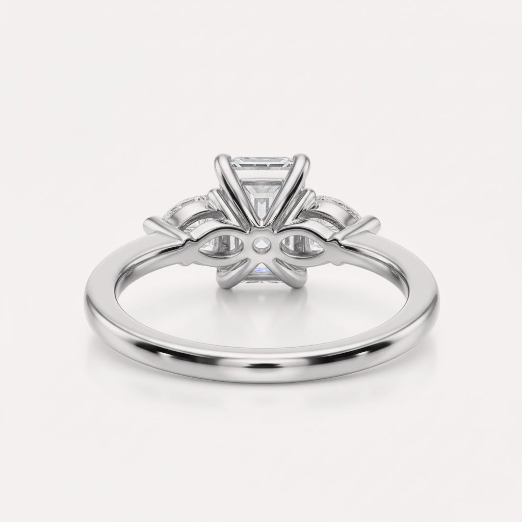 The centerpiece is a magnificent 1.55 ct (approx.) emerald-cut lab-grown diamond, admired for its elegant step-cut facets. It is flanked by two graceful pear-cut diamonds (0.48 ctw), with their points facing outward to elongate the look of the ring on the finger.