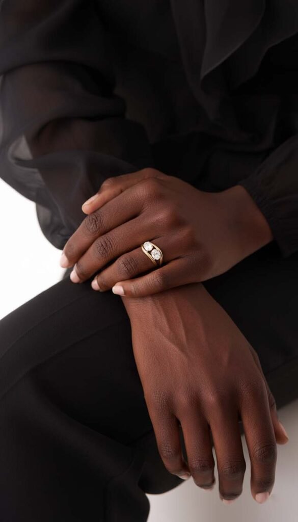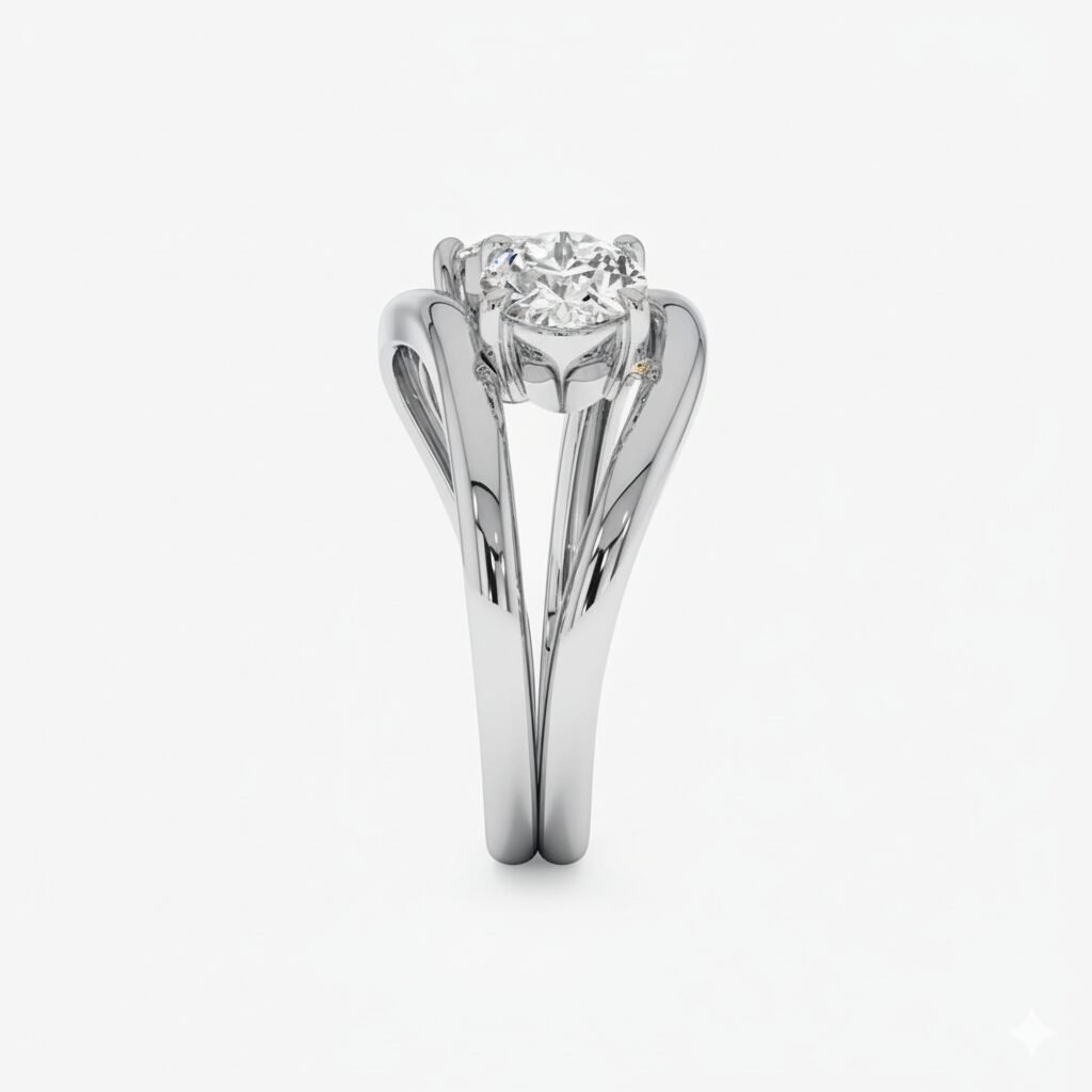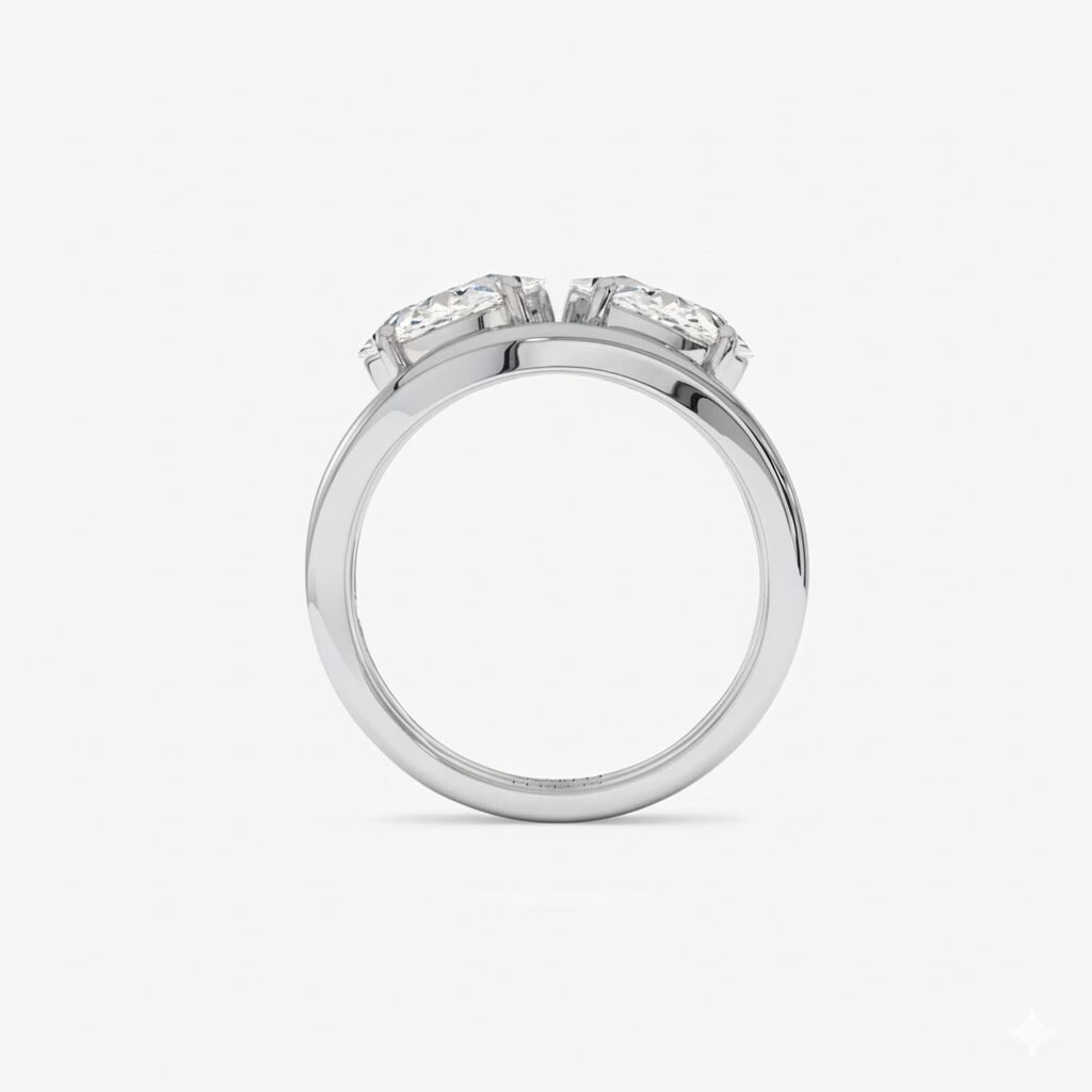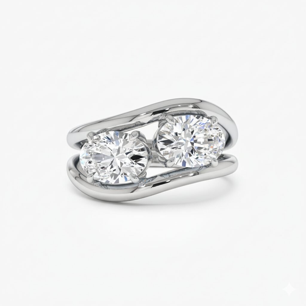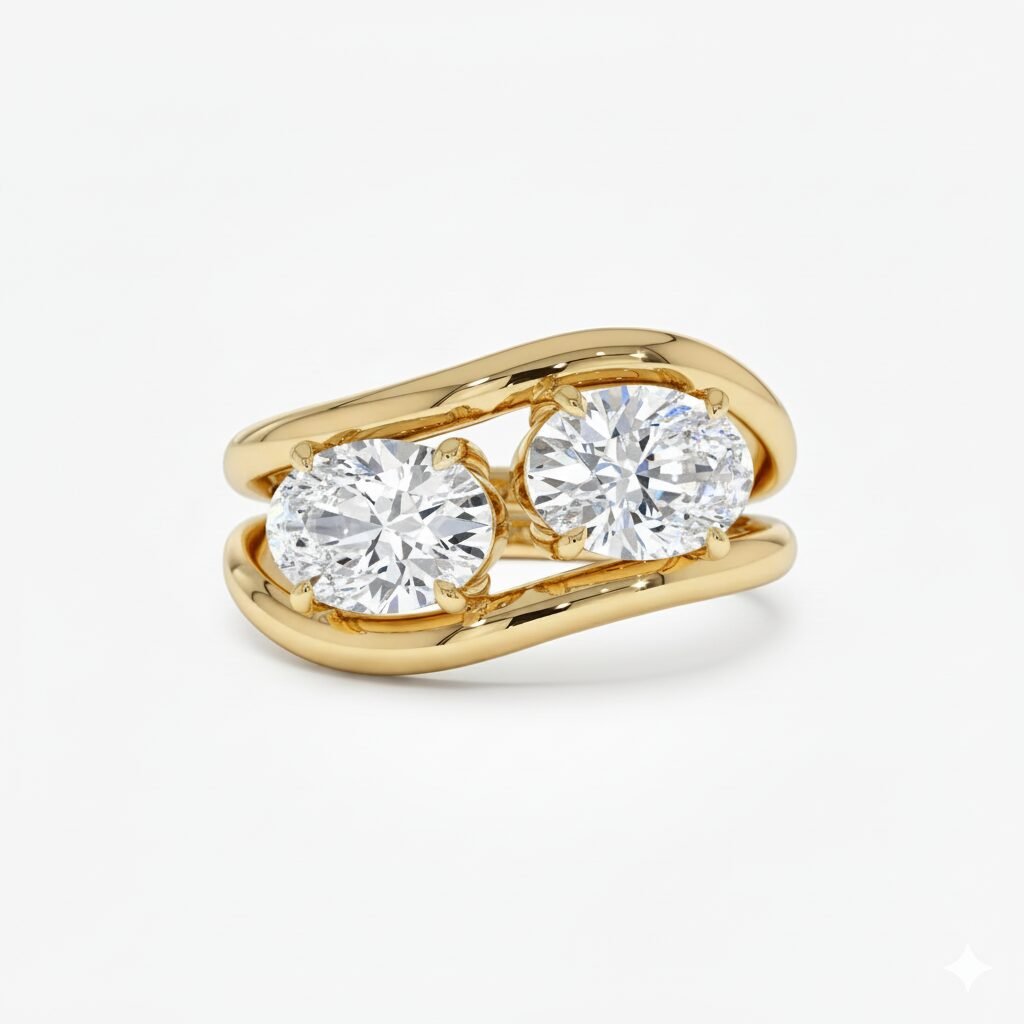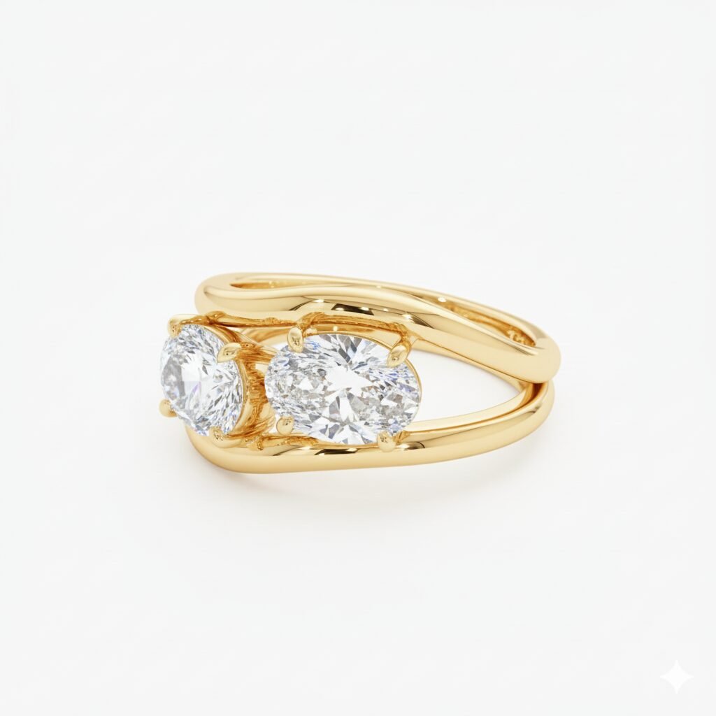 Each ring features a brilliant 1.05 ct (approx.) oval-cut lab-grown diamond set on a fluid, curved gold band. When worn together, they fit snugly to create a stunning “Toi et Moi” (Two Stone) aesthetic. You can also wear them separately as a distinct engagement ring and wedding band.
