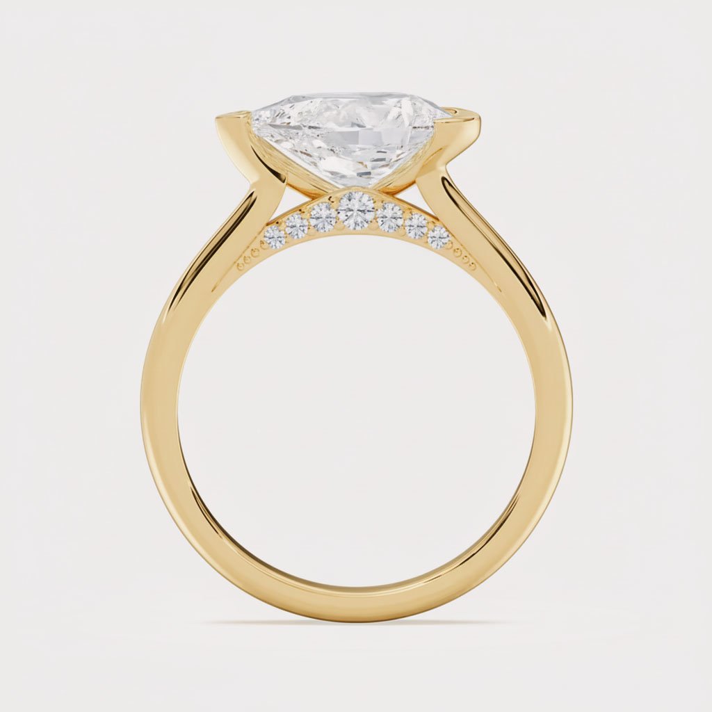 This ring is set in a striking contemporary half-bezel setting, allowing maximum light exposure while providing secure, low-profile wear. Crafted in lustrous 14K Gold, the clean, minimalist design highlights the beauty of the 2-carat center stone. A subtle 0.12 ctw of hidden round diamond accents may be incorporated into the setting structure, adding just a touch of extra sparkle.
