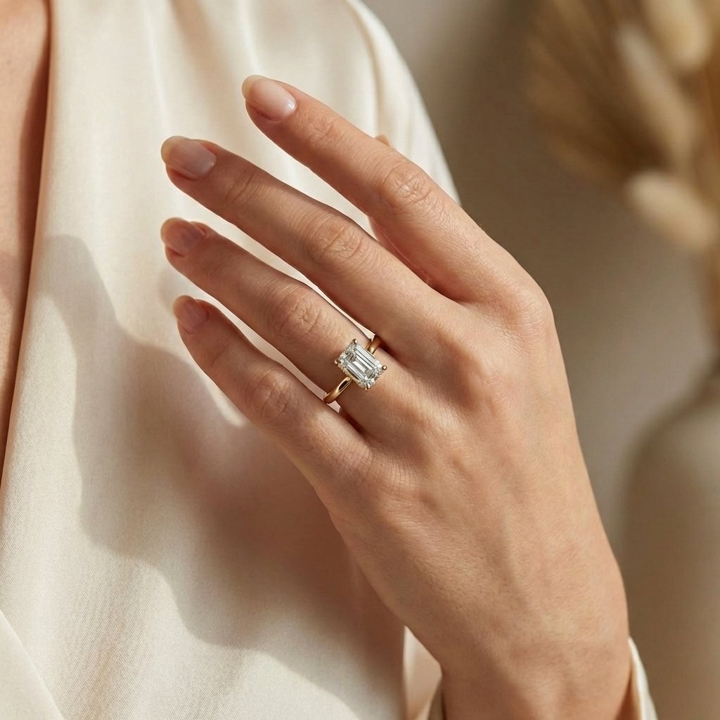 Certified by IGI, the E color, VVS1 clarity CVD diamond reflects unmatched quality and ethical sourcing. The warm tones of 14K gold pair beautifully with the modern elegance of the emerald cut, making it an ideal choice for proposals, anniversaries, and symbolic milestones.