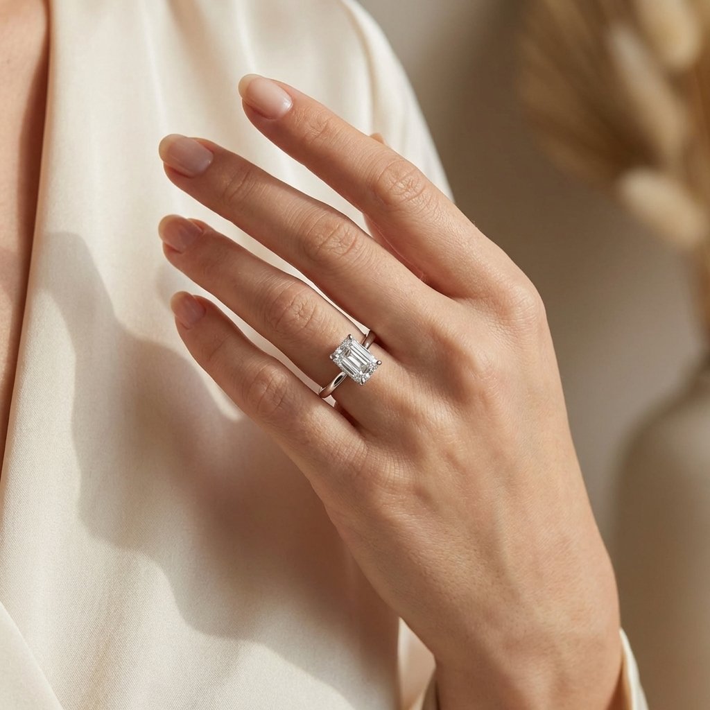 This 2.18 Carat Emerald Cut Lab Grown Diamond Engagement Ring in 14K White Gold is the essence of refined beauty. The elegant step-cut CVD diamond, IGI certified with E color and VVS1 clarity, delivers crisp lines and a mesmerizing play of light—further enhanced by a shimmering hidden halo.