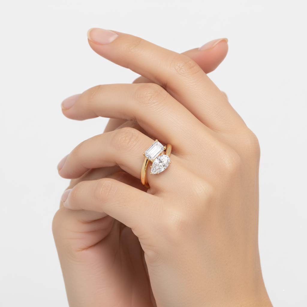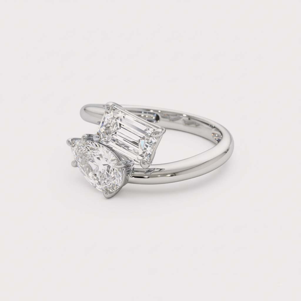 A beautiful symbol of two becoming one, this exquisite “Toi et Moi” (You and Me) ring is the ultimate romantic statement. It features a stunning duo of fancy-cut lab-grown diamonds: a brilliant Pear cut and a sophisticated Emerald cut.