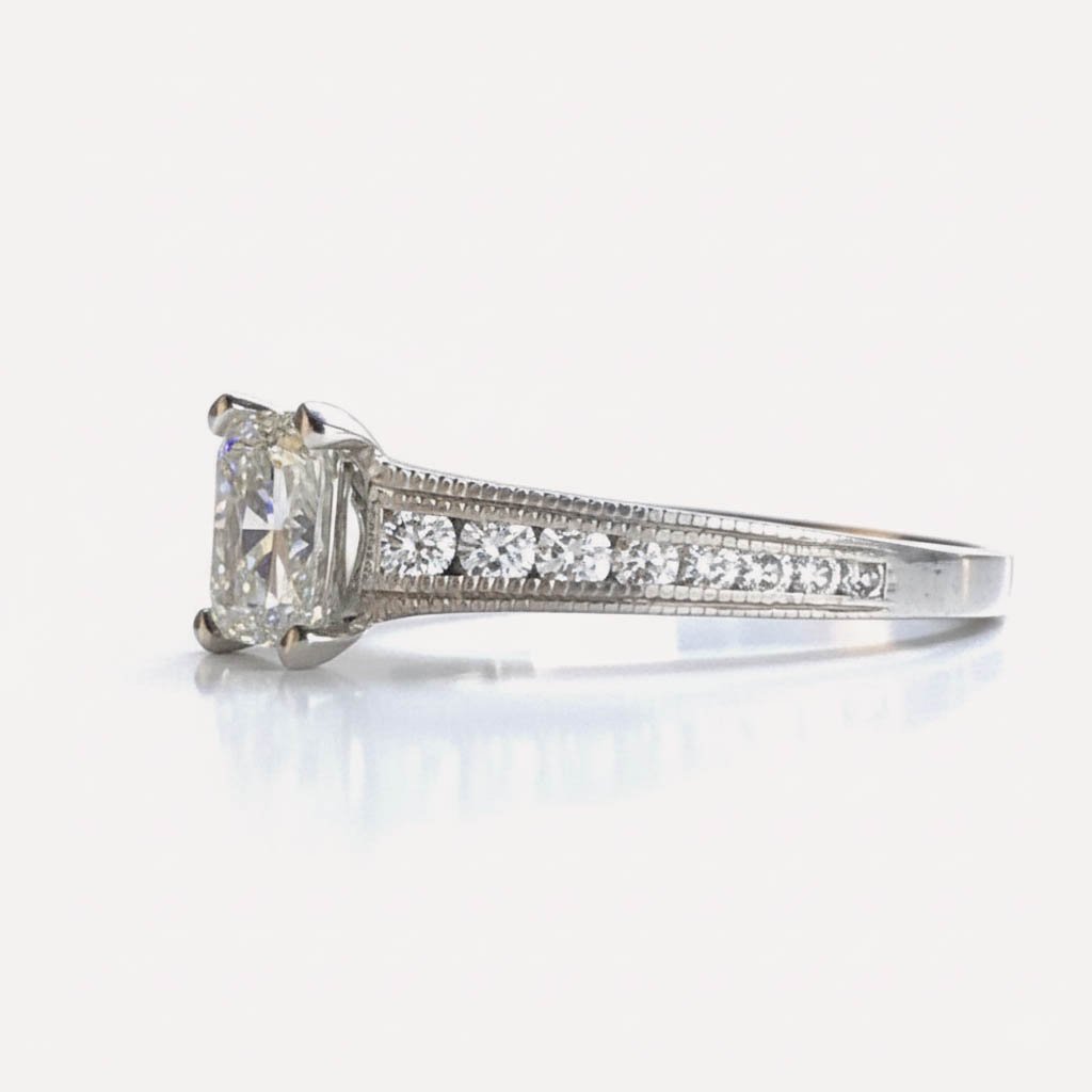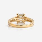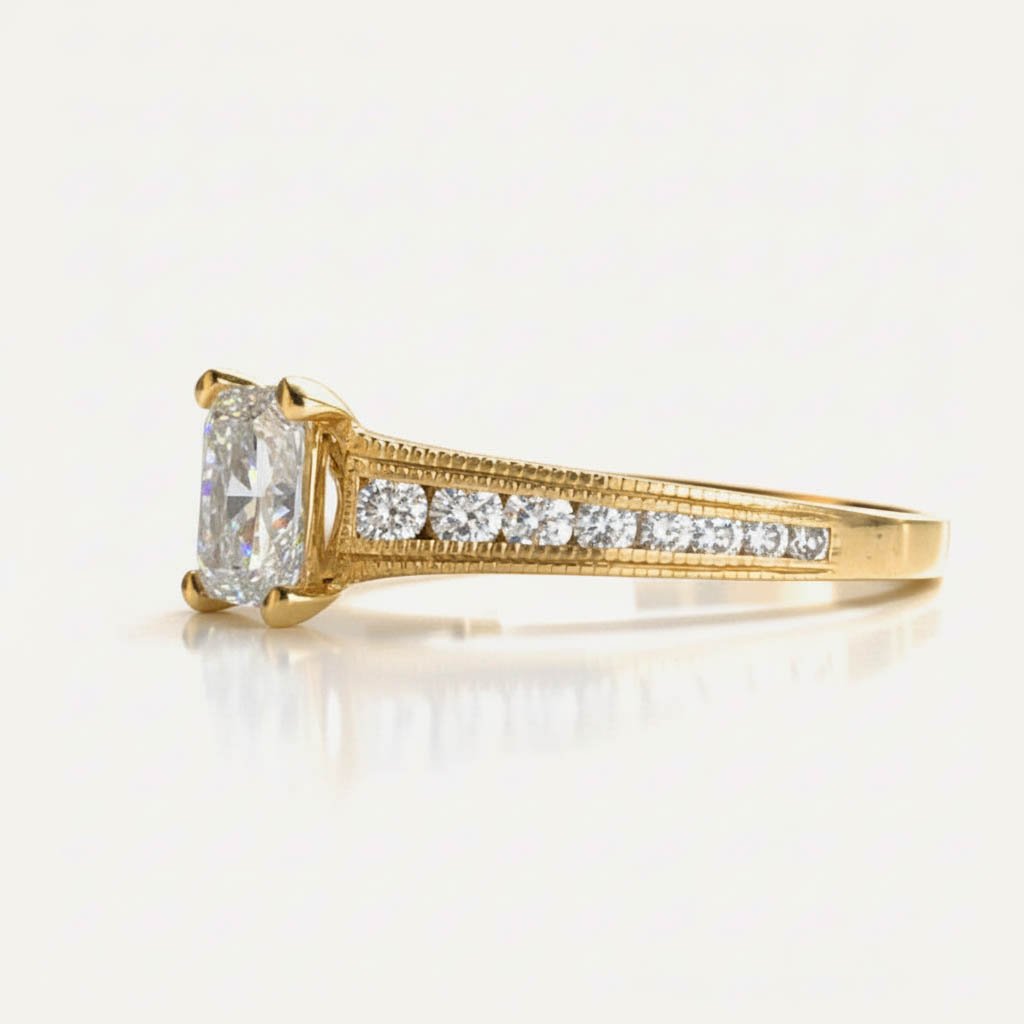 The band features a classic cathedral setting with shoulders adorned by 0.39 ctw of round brilliant accent diamonds. These side stones are channel-set within the gold band and framed by delicate milgrain beading, providing a smooth, protected surface that doesn’t catch on clothing while offering a continuous line of sparkle.