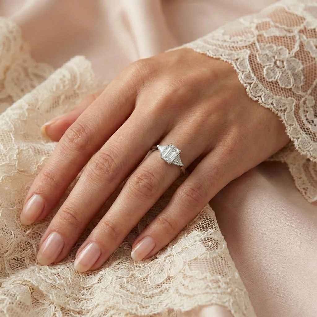 Discover geometric perfection with this IGI Certified Three-Stone Engagement Ring. This striking design features a magnificent 1.52 ct (approx.) emerald-cut lab-grown diamond, flanked by two impressive trillion-cut side diamonds (0.72 ctw).
