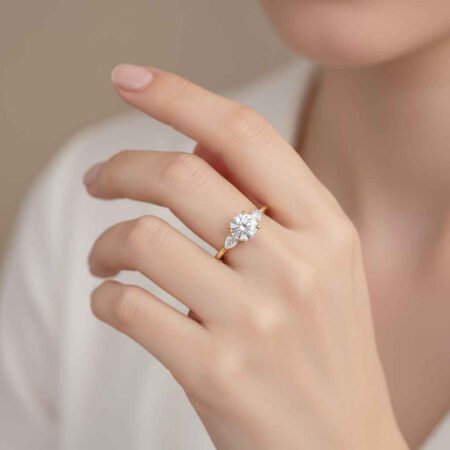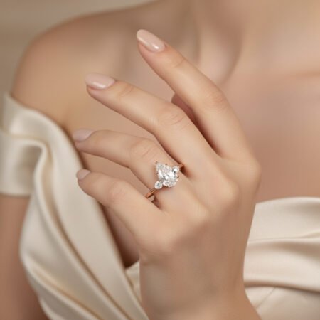 Celebrate your eternal love with our exquisite 2.33Ct Pear CVD Diamond & Tapper Baguette Three Stone Engagement Ring in luxurious 14ct White Gold. This enchanting ring features a captivating pear-shaped CVD diamond center stone, gracefully complemented by two shimmering tapper baguette diamonds on either side, symbolizing your past, present, and future together.