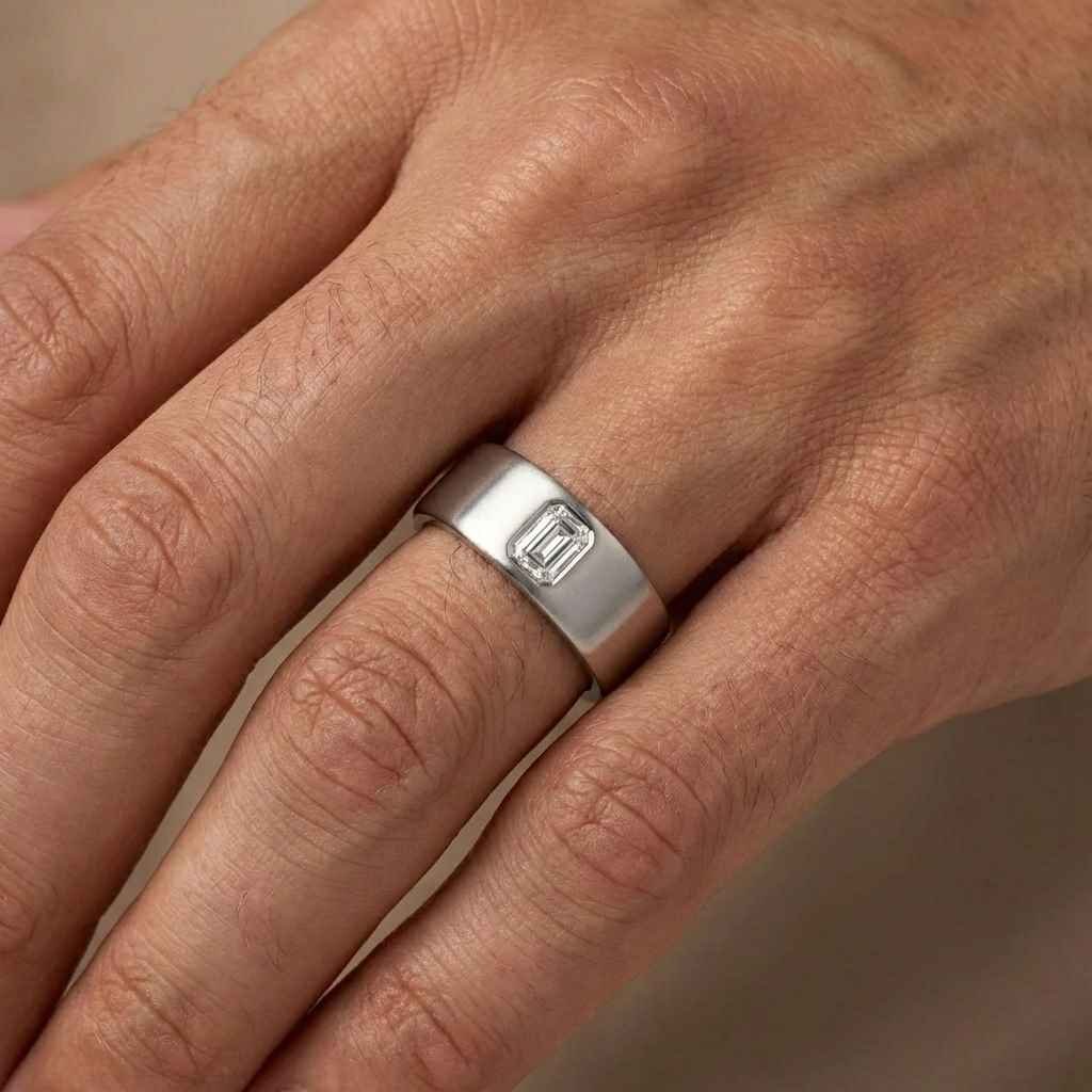 2.50ct Emerald Cut IGI Certified CVD Lab Diamond Ring in 18K White Gold – Modern Bezel Set Wide Band