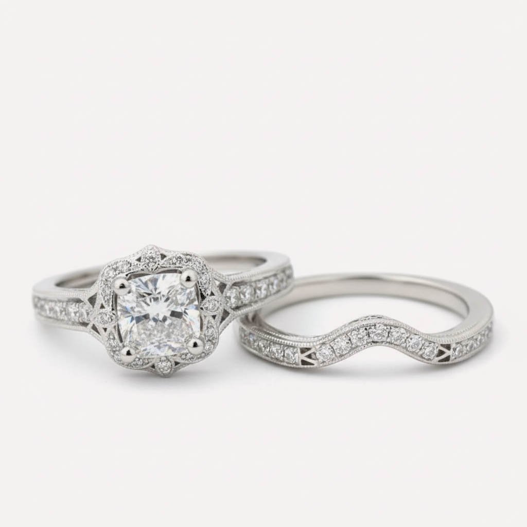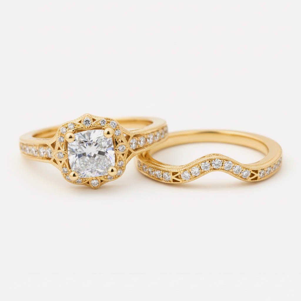 Make a statement of eternal love with this breathtaking 2.55ctw Cushion Lab Grown Diamond Bridal Set. This perfectly paired duo features a vintage-inspired engagement ring and a contour-fitted wedding band, designed to sit flush together in seamless harmony.