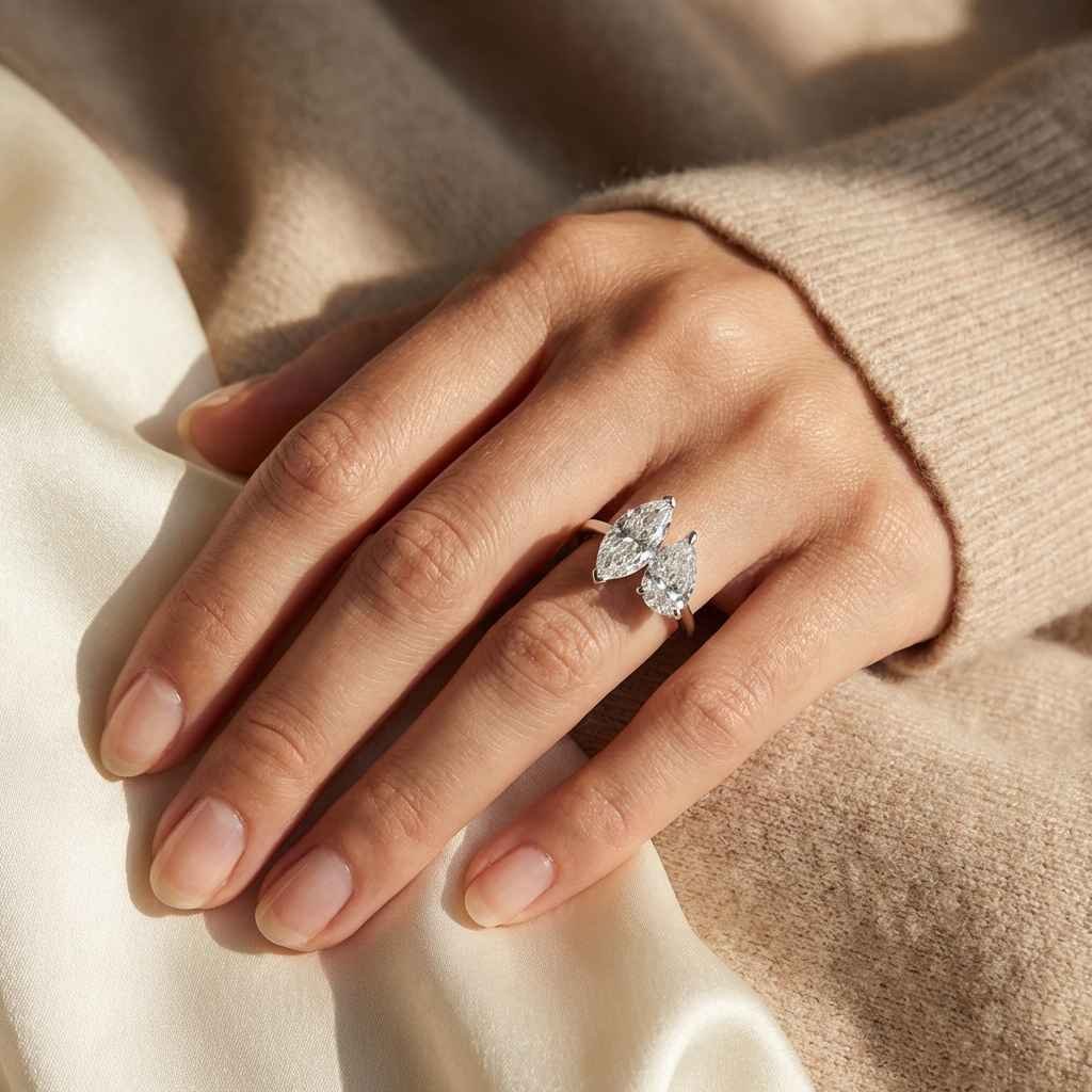 A timeless twist on a classic design. This captivating 2.65ctw two-stone diamond ring features a perfectly matched marquise-cut and pear-cut diamond, creating a sophisticated and modern look. Each diamond showcases an impressive E color and exceptional VS1 clarity, and is IGI certified to guarantee its superior quality and authenticity.