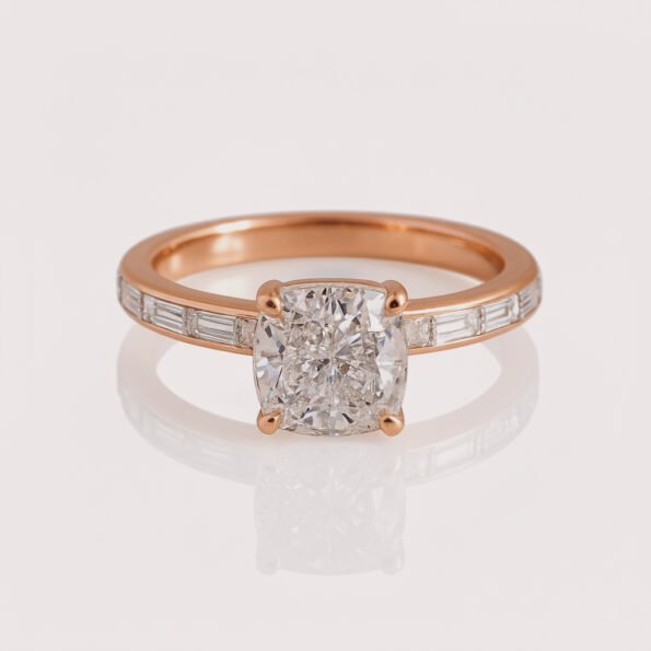 Experience elegance with this 2ct Cushion Cut Diamond Hidden Halo Ring in 14K Rose Gold, a luxurious blend of modern brilliance and classic design. Featuring a 2-carat cushion cut lab diamond, this halo diamond ring is designed to maximize brilliance. The 0.48ct round hidden halo and side baguette-cut diamonds add depth, sparkle, and a unique touch to this engagement ring.