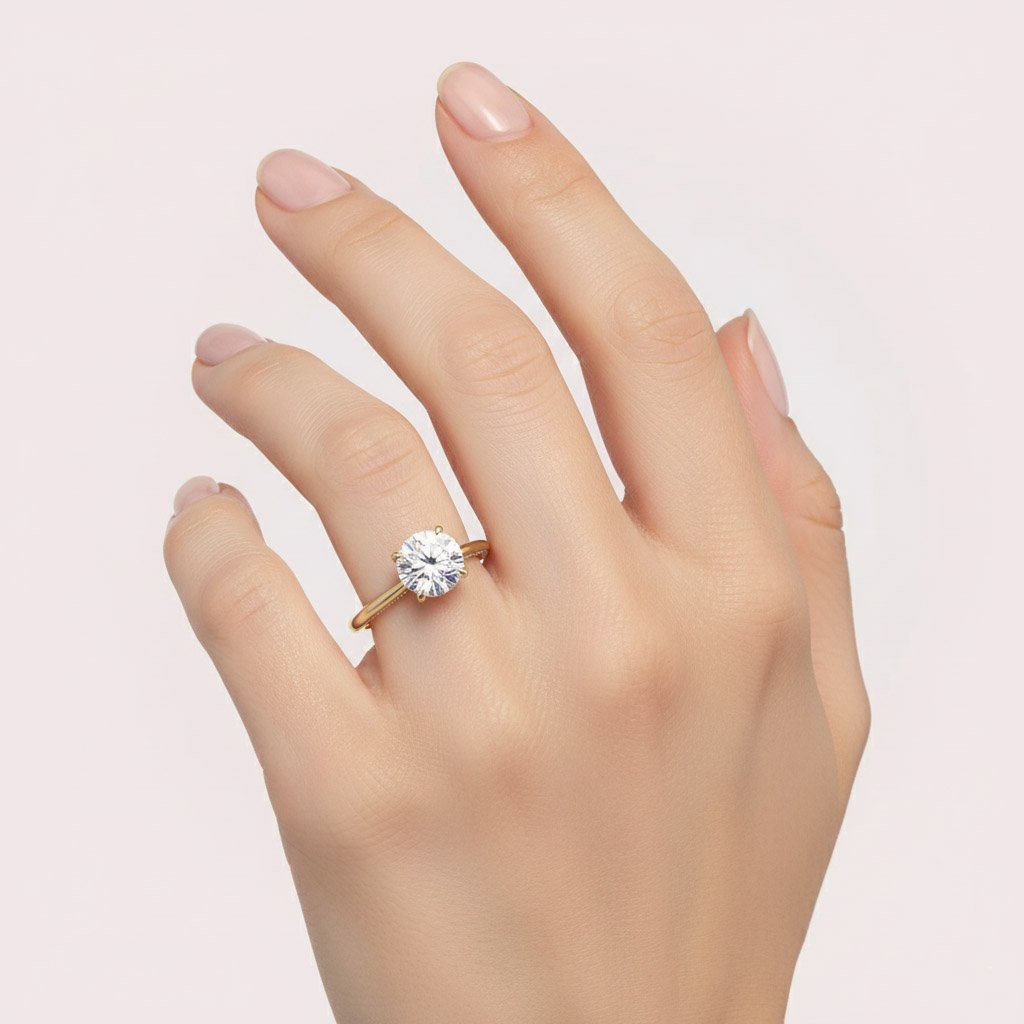 Discover timeless elegance with this 2CT round diamond ring, a true statement of sophistication and brilliance. Crafted in 14K gold, this stunning solitaire ring features a 2CT round lab diamond with a minimalist front design and sparkling diamond-studded sides, making it an exceptional choice for those seeking the best engagement rings.