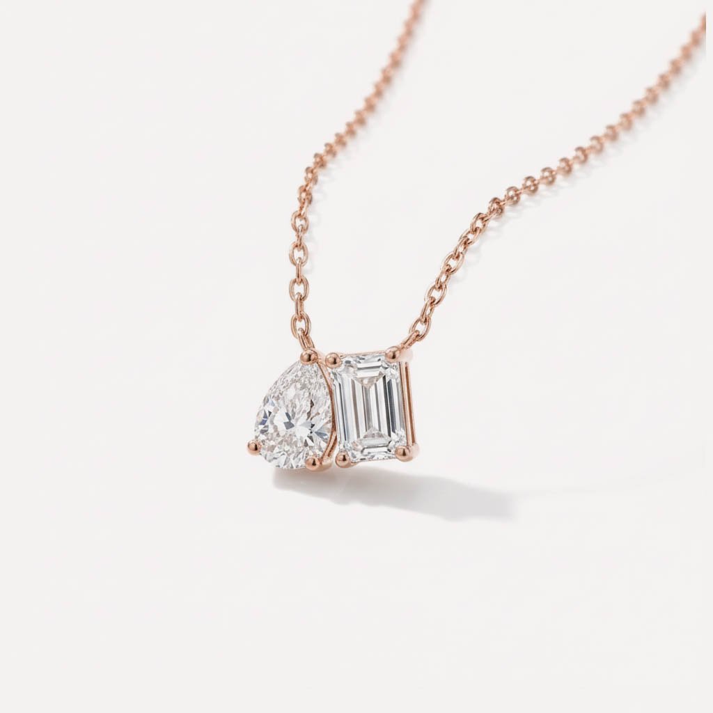 Express your love with the 3.12CTW Toi Et Moi Necklace, a breathtaking lab diamond necklace crafted in 14K rose gold. Featuring Pear and Emerald cut lab-grown diamonds, this gold pendant necklace symbolizes unity and romance, making it the perfect anniversary gift for her or a sentimental first wedding anniversary gift.