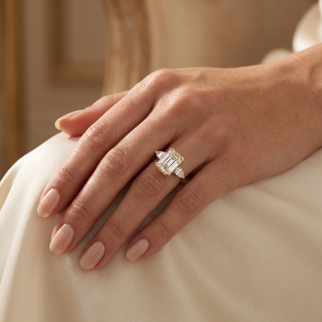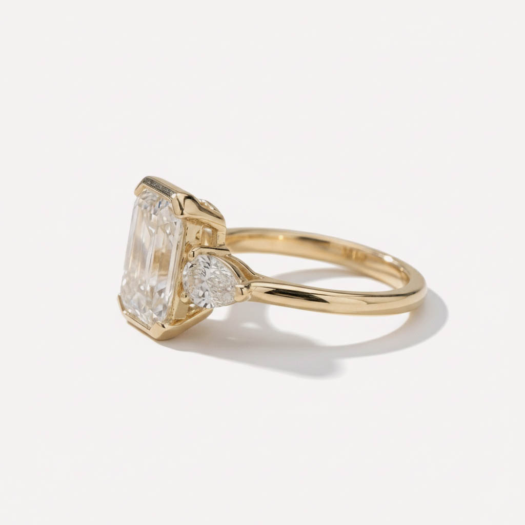 The emerald cut delivers a classic hall-of-mirrors sparkle, while the pear side stones enhance the finger coverage and create a graceful, elongated silhouette. Set in a sleek four-prong bezel-style frame, this ring blends modern luxury with vintage-inspired charm.