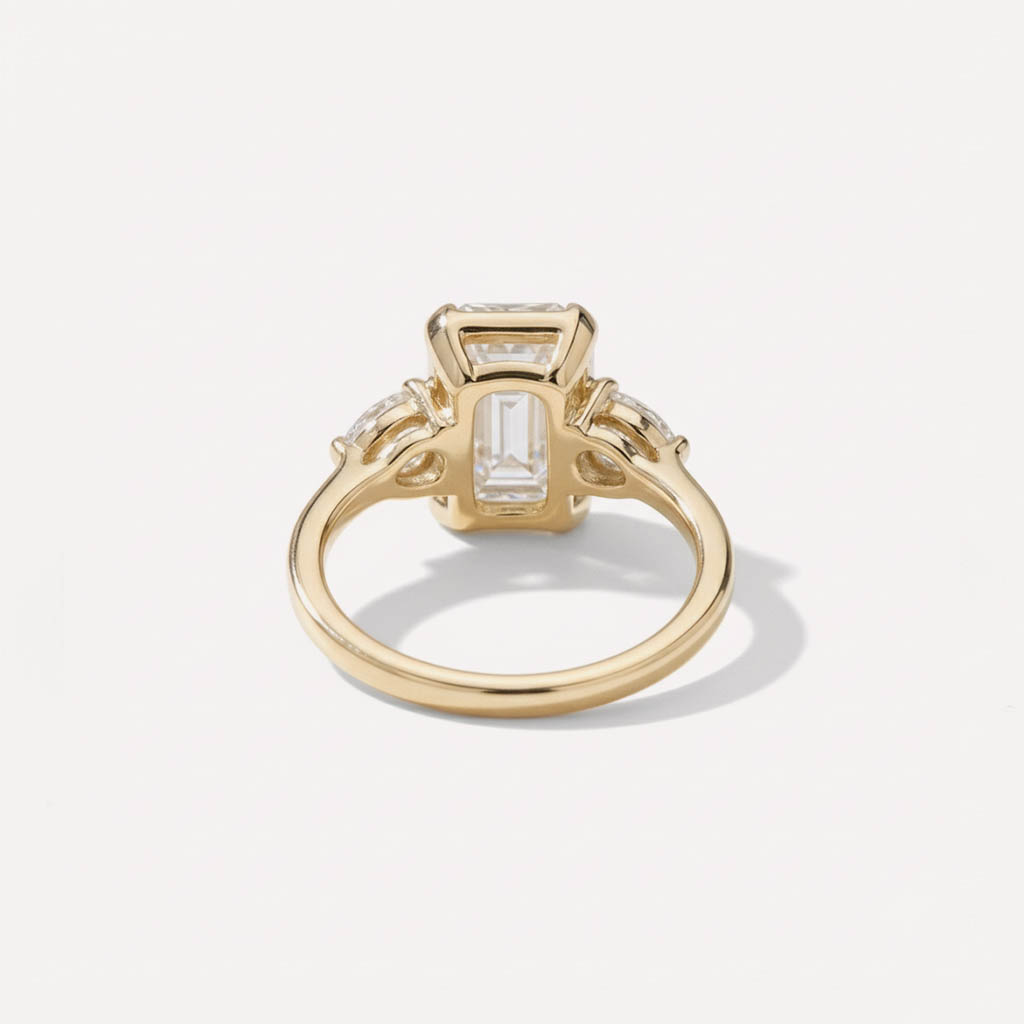 This refined three-stone design features a breathtaking 3.55 ct emerald-cut center diamond, accented by pear-shaped side diamonds that add soft brilliance and romantic balance.