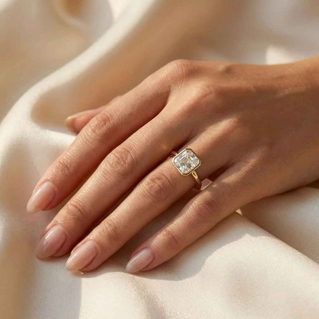 The bezel-set engagement ring provides a secure setting that enhances the diamond’s beauty while offering extra protection. Its Asscher-cut lab diamond reflects light in a mesmerizing pattern, making it a timeless choice for engagements, birthdays, anniversaries, and luxury gifts for moms.
