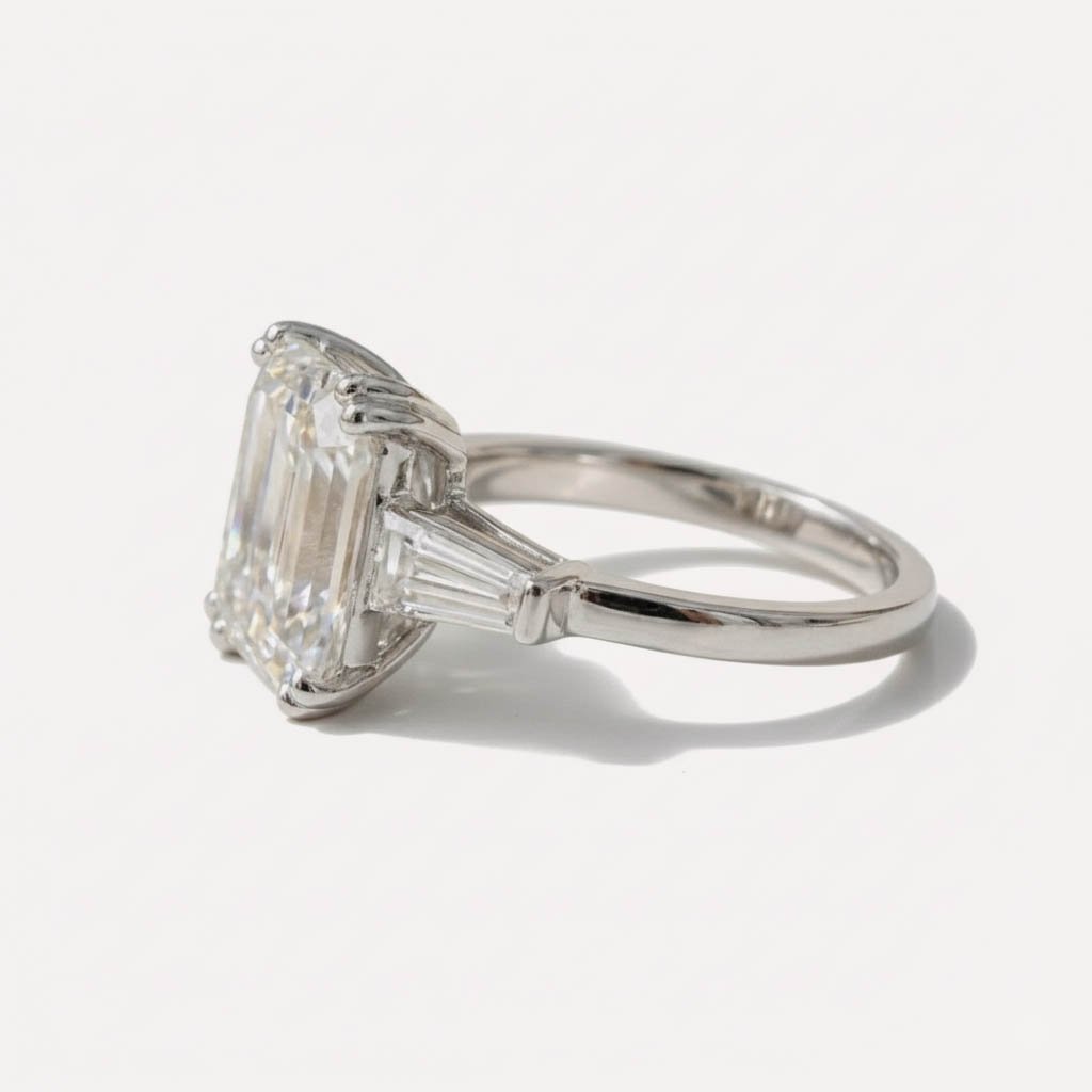 Experience timeless elegance with this 3CT IGI Emerald Cut Three Stone Lab Diamond Ring in 14K White Gold. Designed for those who appreciate sophistication, this three stone ring features a certified 3-carat emerald cut lab-grown diamond at its center, complemented by two tapered baguette lab diamonds. This exquisite lab diamond ring symbolizes love, commitment, and a bright future.